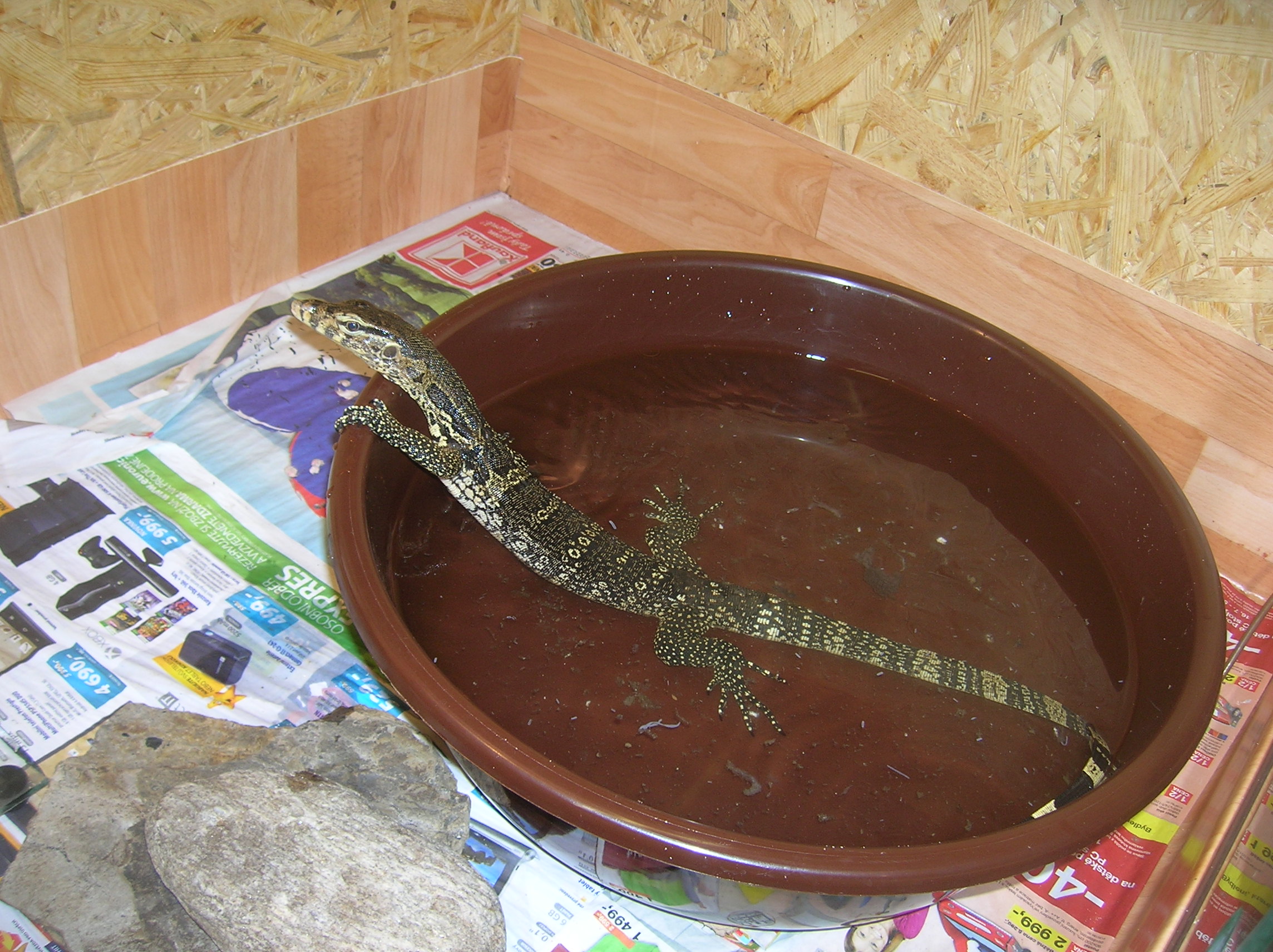 K bazénku tam je docela dobré hlídat vodu páč se do ní v 99% vyprázdní(většinou po krmení)a pokud v ní i žere je dobré mu ji často měnit za čerstvou=vlažnou= nějací jsou docela fajnšmekři a do zaprděné vody =vyjma spánku v noci=se jim moc nechce dáš vlažnou čistou a zaleze do ní.Té vody musí mít zhruba+- autobus tolik aby se v ní pokud si lehne potopil i na zádech samo musí být prostorný atˇ může "plavat" šmejdit jestli v ní i chrní tak mu tam vraž nějaký šutrák dá si na něj hlavu a cítí se bezpečně.