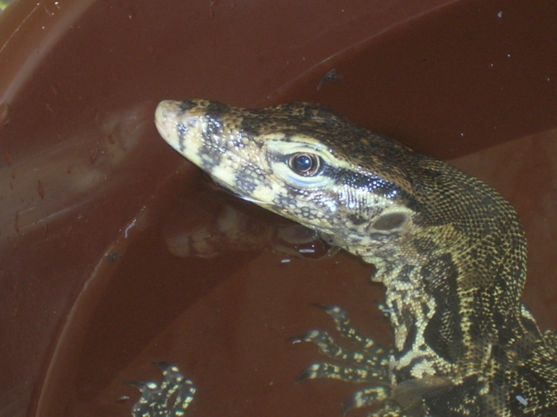 Jinak přikládám ještě fotky z předvčerejška, taky fotím takovým chrastítkem, takže kvalita tomu odpovídá. Co se týče vzteklosti, tak krom toho posykávání, o němž jsem psal výše, tak je varan spíš plašší, na vyrušení mimo úkryt reaguje tím, že se stáhne do rohu nebo pod vodu, pokud ho moc štvu, tak někdy odkráčí, někdy uteče do bedýnky. Ocasem švihnul jen jednou a to když mu po zádech lezla myš