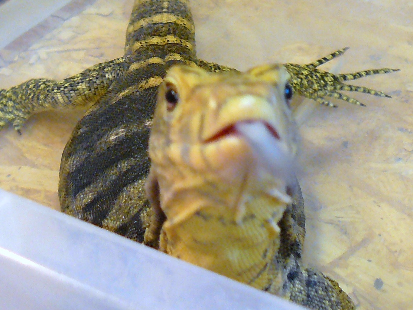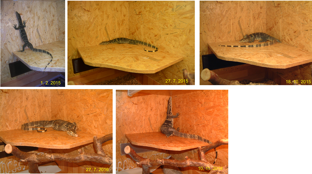. Jinak musim říci, že varan má úžasný pozorovací smysl, neboť se naučil reagovat na mne (většinou stažením do kouta) při mém vstupu do místnosti, kdy mne může vidět pouze v odraze kousku zrcadla.