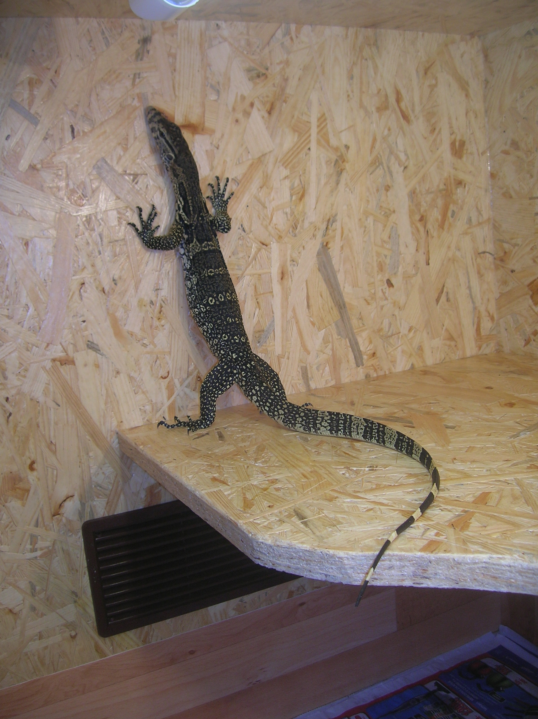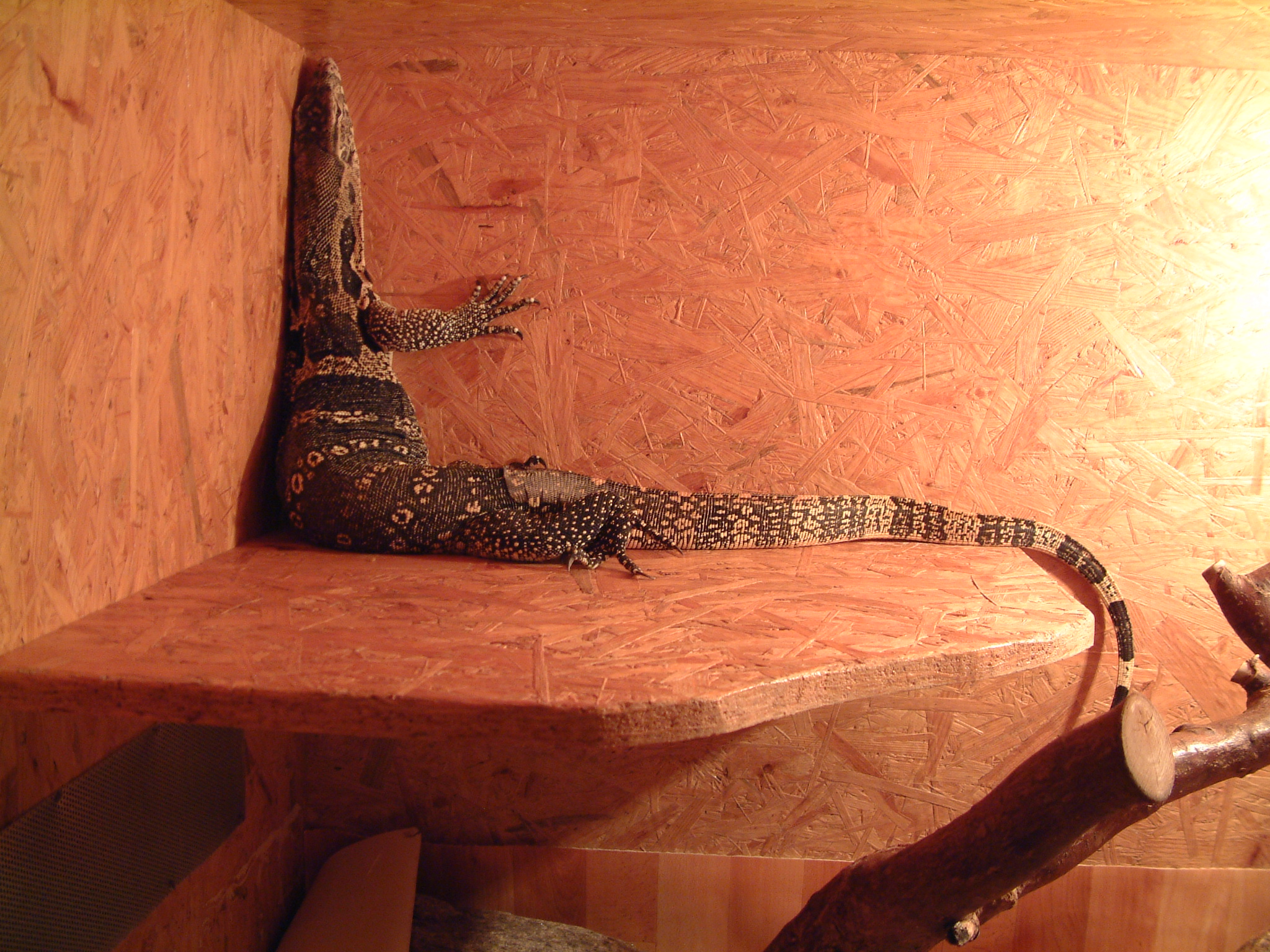 Varan teď tráví většinu času na vyhřívací polici. Tam ho také odpoledne krmím, ale opět tím stylem, že krmení položím vedle něho a musím jít pryč ode mne z pinzety si nevezme a když jsem v místnosti tak musím být dost v povzdálí. Teď jsem krmil kuřecími křidýlky a to mu evidentně šmakuje, zkusil jsem i ty slimáky (z lesa), ale nesetkali se z žádným ohlasem.