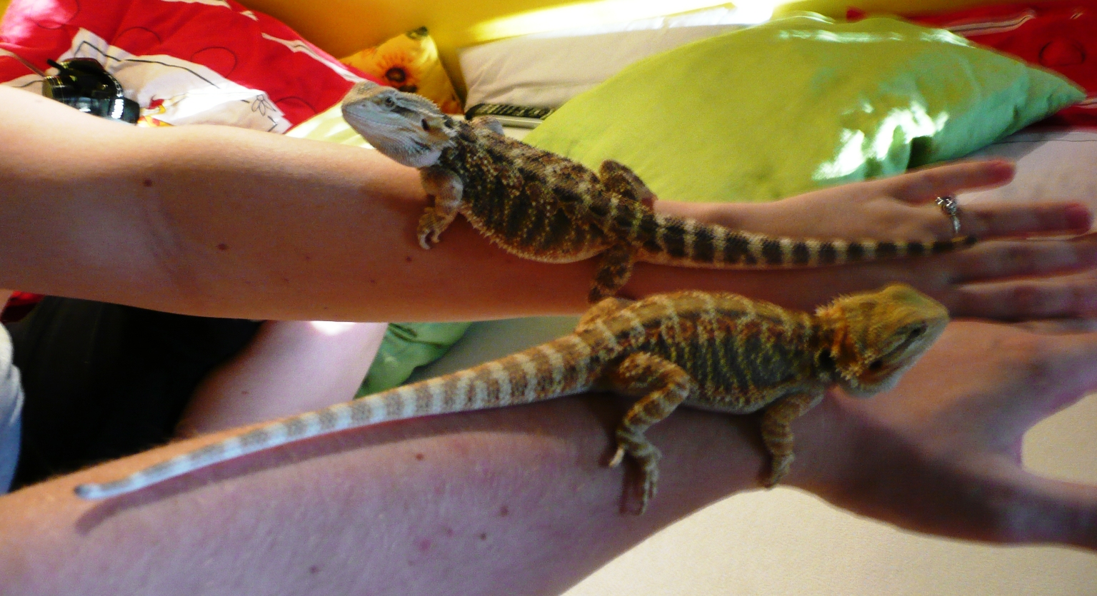 Chtěla bych se zeptat ještě na aktuální velikost našich žroutíků, jeden se projevuje jako opravdu dobrý jedlík, agamy máme cca 1,5 měsíce, sameček Jamall vyrostl z 19cm/36g na 28,5cm/122g a Harry z 20cm/38g na 28cm/87g. Původně menší z nich toho o chlup většího váhově přerostl, ale chci se zeptat, jestli jsou ve stáří cca 3-3,5 měsíce tyto míry v pořádku? Podmínky už jsem zde řešila dříve, byly shledány některými z vás v pořádku, a i podle toho, jak agamy rostou soudím, že se jim u nás daří dobře... Přesto uvítám reakce a názory zkušenějších...
