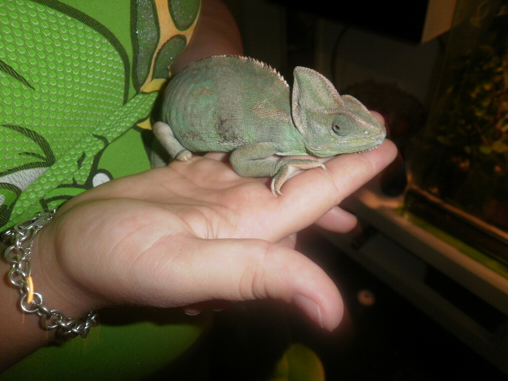Tak to terárium je zcela špatně.Určitě vás to stálo spoustu peněz,ale pro chameleona je k ničemu a je pro něho nebezpečné.Viděl bych to na rachitidu,jelikož vaše zvíře nemá UVB záření.Nevím co více už to je jen na vás.