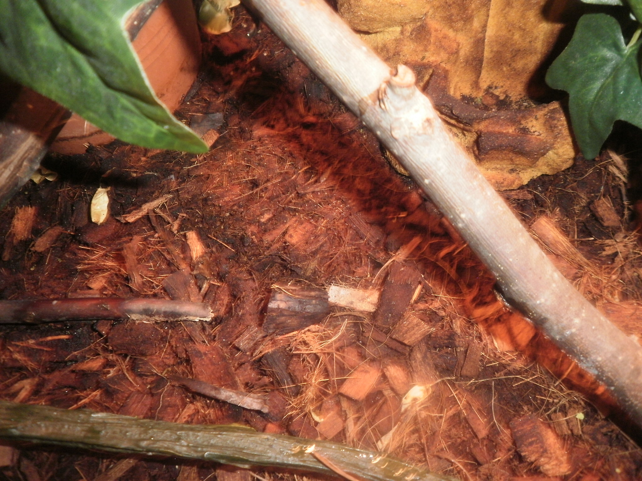 To terárko je celkem malý, ale to samo o sobě ho nezabije. Co je horší, je, že je podle mě blbě větraný. Má tam málo větví, ten lignocel na dně je pěknej průšvih (když ho omylem s cvrkem sežere, může to bejt konečená) a HLAVNĚ - čim mu svítíš kromě tý bodovky v květináči? Má tam nějaký UVčko??? A dáváš mu nějakej samostatnej vápník? (Biomin H, Plastin, Microcalcium..??).