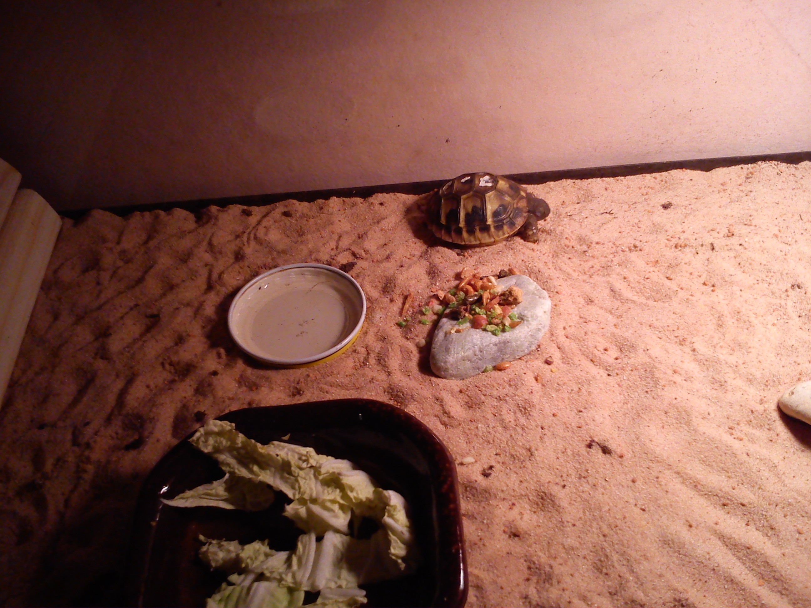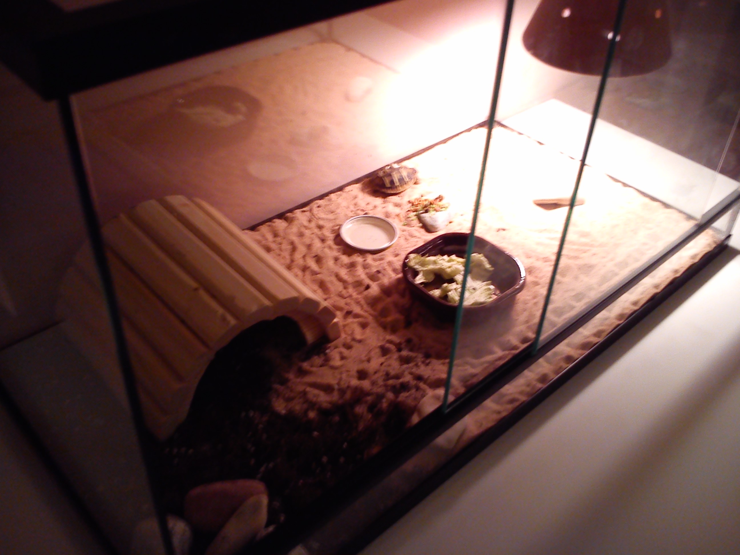 To terárko je uplně špatně zařízené a želvička už nevypadá zrovna happy, je hodně vyschlá. Což se za daných podmínek nelze moc divit...jako substrát jí tam dejte aspoň ty 3cm, lépe 5cm vrstvu směsi hlíny a písku- stačí písek do dětských hřišť. Z poloviny ji udržujte suchou a z poloviny vlhkou, do kouta dejte vlhké drny nebo hromádku vlhkých hoblin, aby se želva měla na noc kam zahrabat do vlhka. Pokud to neudělá sama, tak ji na noc do těch hoblin zahrabte vy. Ta želvička už je opravdu hodně vyschlá a je otázka, jestli to vůbec rozchodí. ten domeček pro křečky vyhoďte, ten není k ničemu. Místo něj tam opřete třeba kus korkové kůry. Dodejte jí lokální zdroj tepla s teplotou okolo 30-35°C. Misku na krmení má hrozně vysokou, do té se nedostane- stačí, když jí dáte krmení na podmisku pod květník, nebo na nějaký tácek. Gammarus jí vůbec nedáveje, je nevhodný jak pro želvy, tak pro leguány. A s těma změnama rozhodně nijak neotálejte, pokud už není pozdě...