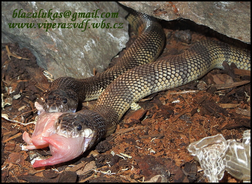 Tak trochu z jiného soudku, samice sežere každej čtvrtej den dvě myšata, ale jenom mastomyši, normální holata nechce, mrcha jedna. už jsem založil chov mastomyší, ale ještě nenesou, takže zatím kupuju. Se samcem je to horší, sice žere normální holata, ale jenom občas.