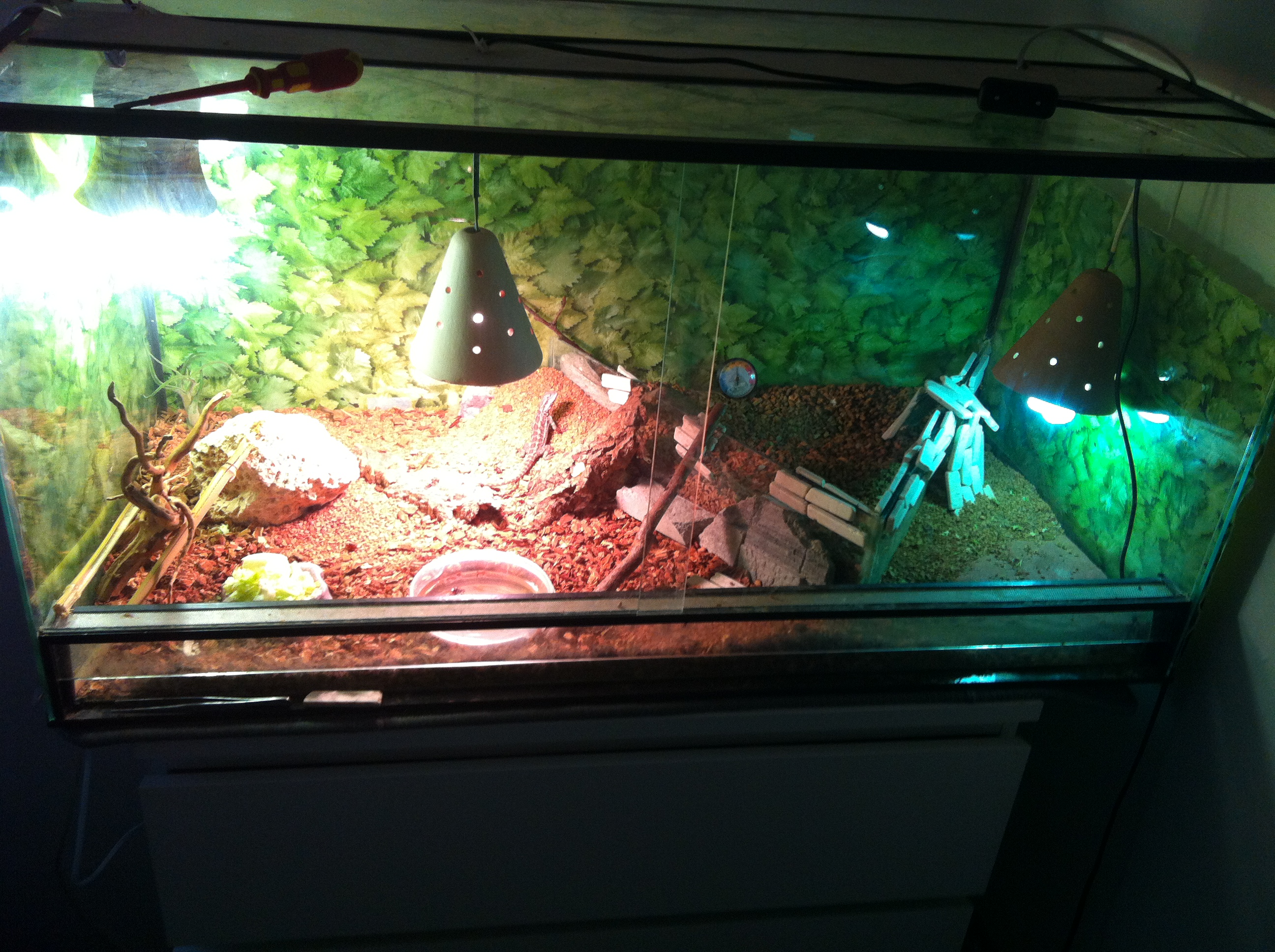 Terarko je prazdne, svetla su dane zle, Repti Glo je slabe, na takz vzdialenost ako je na fotke uz duplom a ak tam nema aspon 10,0 tak je tam UPLNE ZBYTOCNE. Dvojku by som nedaval ani rastlinam a nie fuzatke.
