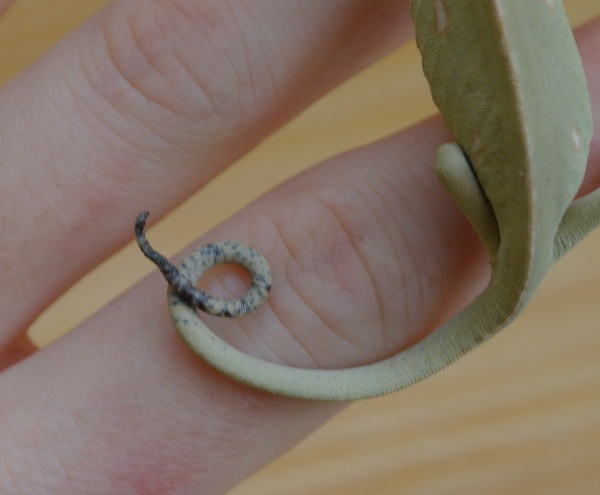 Dnes ráno jsem vstala a s hrůzou zjistila, že má jedno mládě zčernalý a pokroucený ocásek. Dříve jsem si toho nevšimla (je možné, že jsem to přehlédla). První co mě napadlo bylo, že si ho popálil o žárovku. Nad odchovnou nad pletivem mám 25W bodovku. Je sice v dostatečné vzdálenosti, ale mohlo se stát, že chamik ocas prostrčil pletivem a popálil si ho.