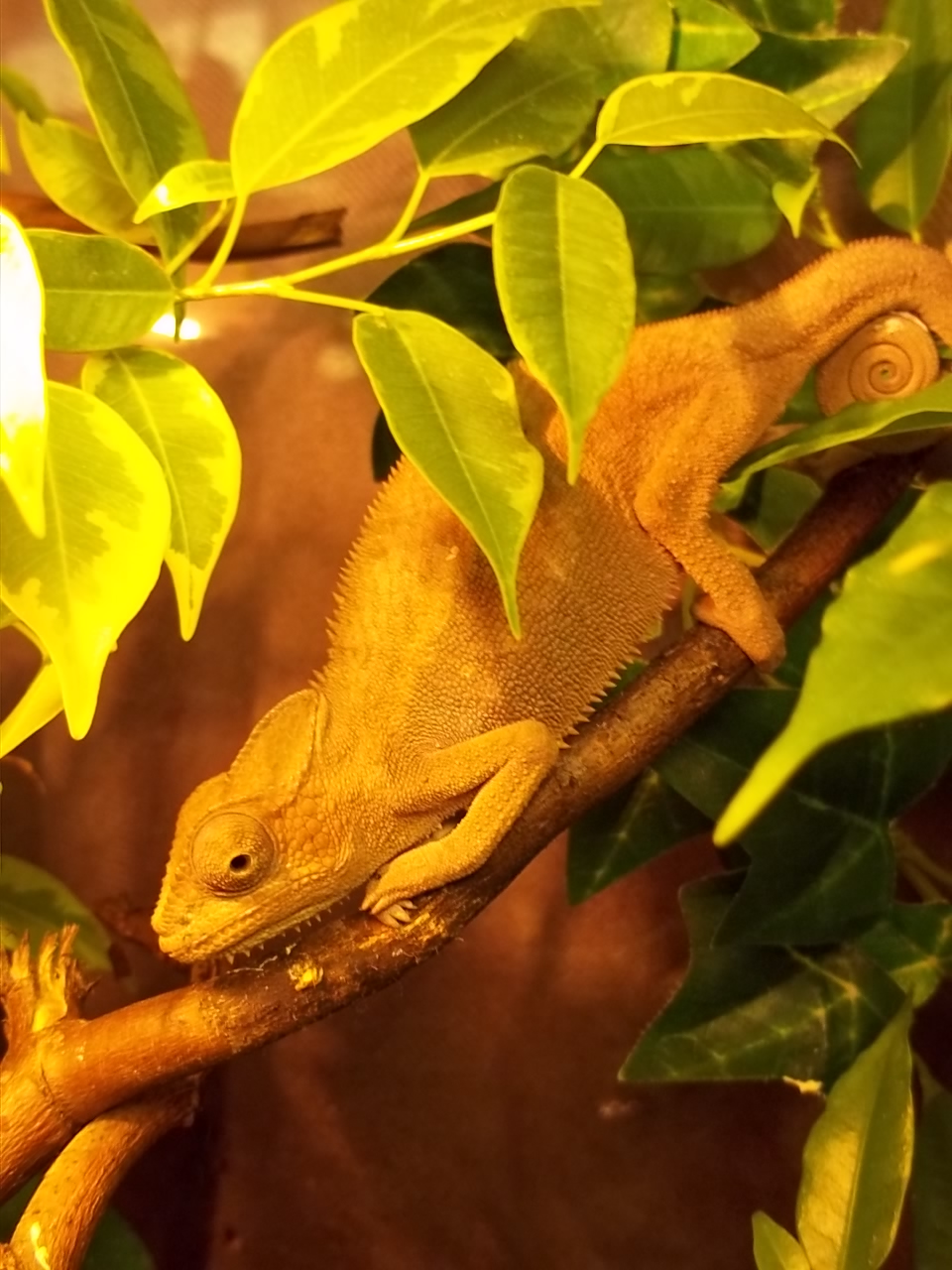 Chov: tero 60x40x80, teplota hore 26 (pod žárovou víc), zářivka, UVB Repti glo, živé rostliny i umělé, věrve, vlhčím 2x denně.