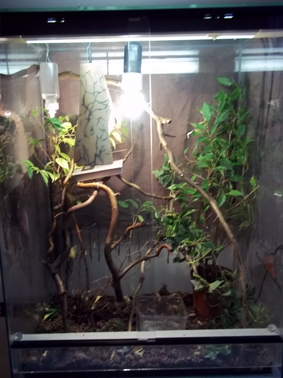 Chov: tero 60x40x80, teplota hore 26 (pod žárovou víc), zářivka, UVB Repti glo, živé rostliny i umělé, věrve, vlhčím 2x denně.