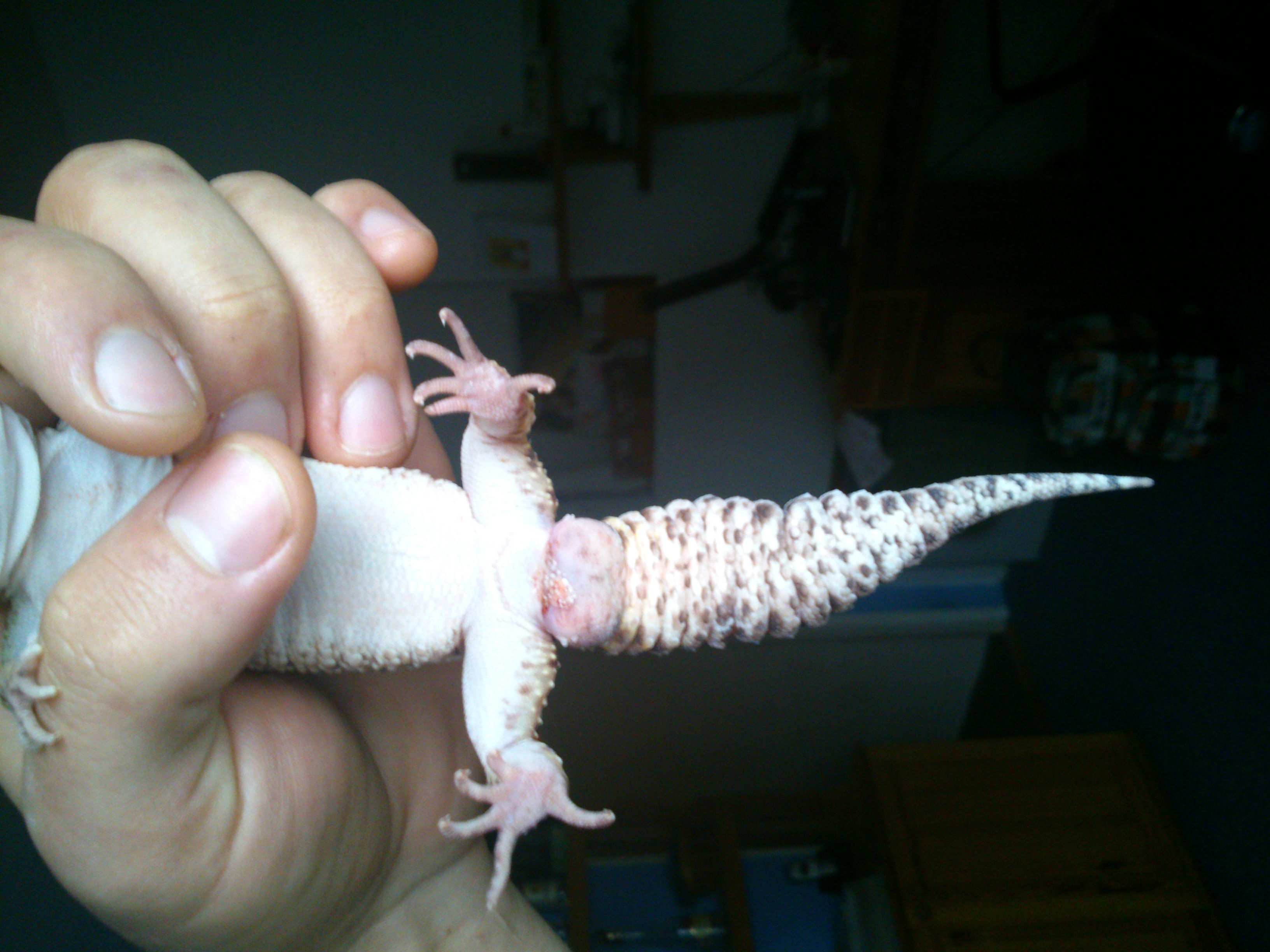 jak psal kolega nade mnou, je to zánět hemipenisových kapes, a už pořádně rozjetý. to se mělo řešit hned v začátku a ne to nechat dojít takhle daleko. Doma s tim už nic nenaděláš, zajdi s nim k veterináři se specializací na plazy. Asi to bude muset rozříznout, vyčistit a dát zvířeti antibiotika, možná i amputovat hemipenisy. Podle toho, jak moc budou zánětem poškozené...ale počítej s tím, že kluk už si nevrzne.
