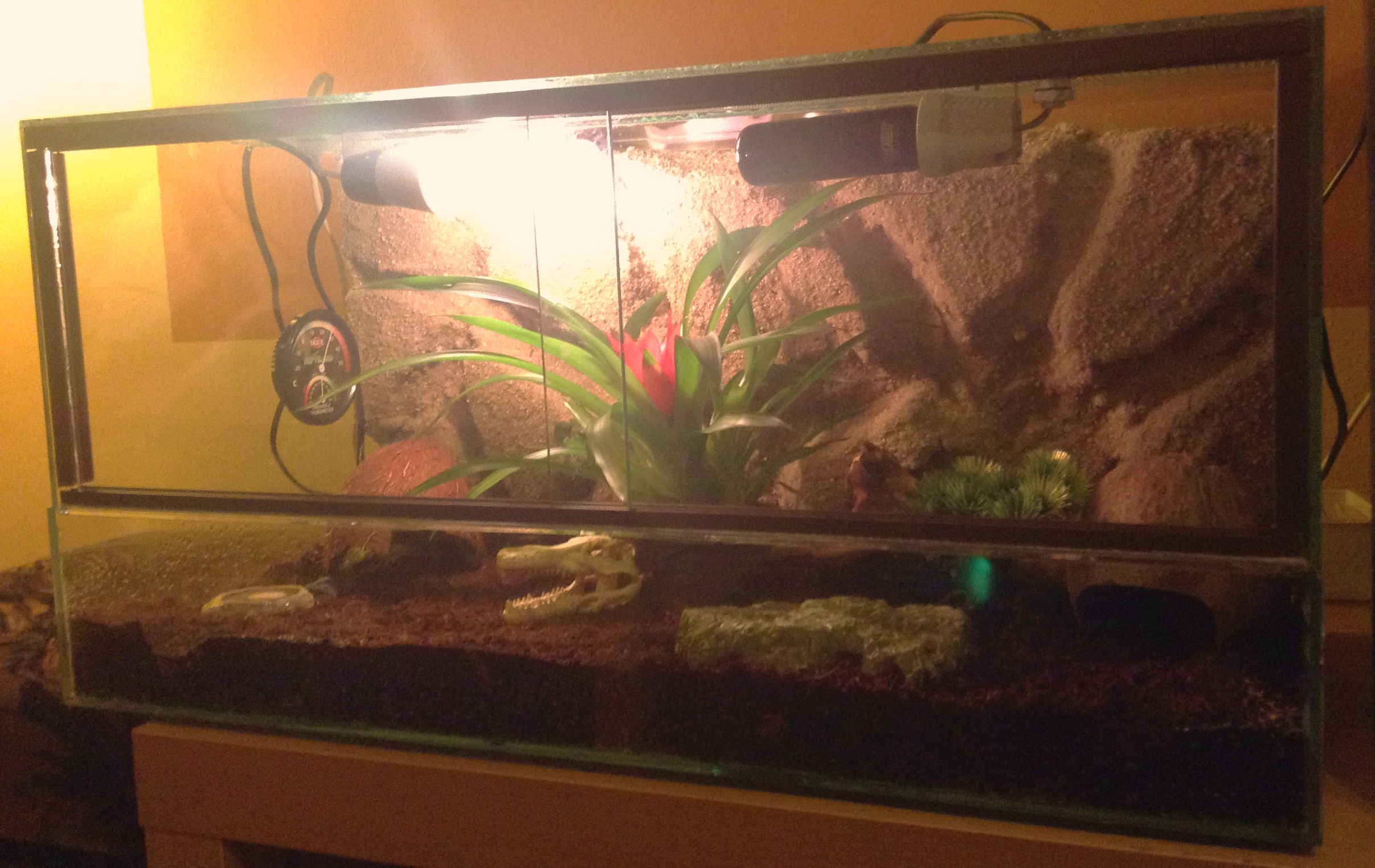 60x30x30 , tropický klima se skalou vzadu, ze ktreré jsou velice nadšení a po nocích po ní neustále šplhají i loví.Živá rostlina, kokosový úkryty,kamenná miska, topný kámen, svetlo denní a noční a vše na lignocelu vespod s rašelinou, teplotua vlhkost hlídaj budíky nastraně.