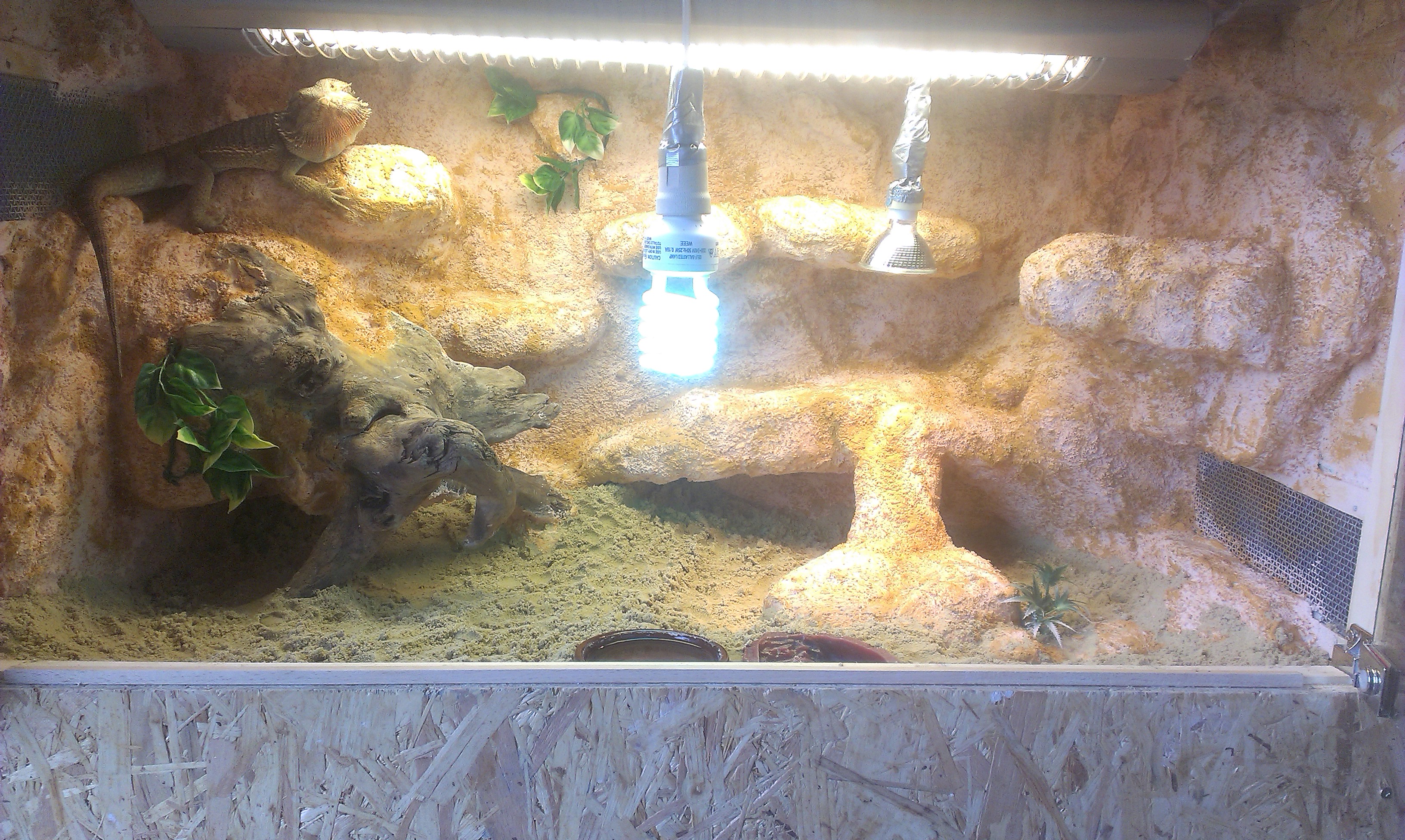 Zdravim,agame som spravil nove terarium z OSB dosiek o rozmeroch 90*50*50,vetranie ma na bocnych stranach hore a dole a na plafone. Neviete mi prosim vas poradit ako s osvetlenim? staci na tie rozmery jedna ziarovka RG 10.0 26W ako UVB zdroj,jedna obycajna ziarovka nad kamenom na vyhrevnu funkciu(asi 40W uvidim ked odmeram teplotu ci bude stacit) a jedna linearna trubica ako zdroj svetla?-k tej trubici: dlzka trubici-dlzka teraria -90 cm a priblizne kolko wattow ma mat? Vopred dik za odpoved.pridavam fotku teraria bez osvetlenia a plafonu.