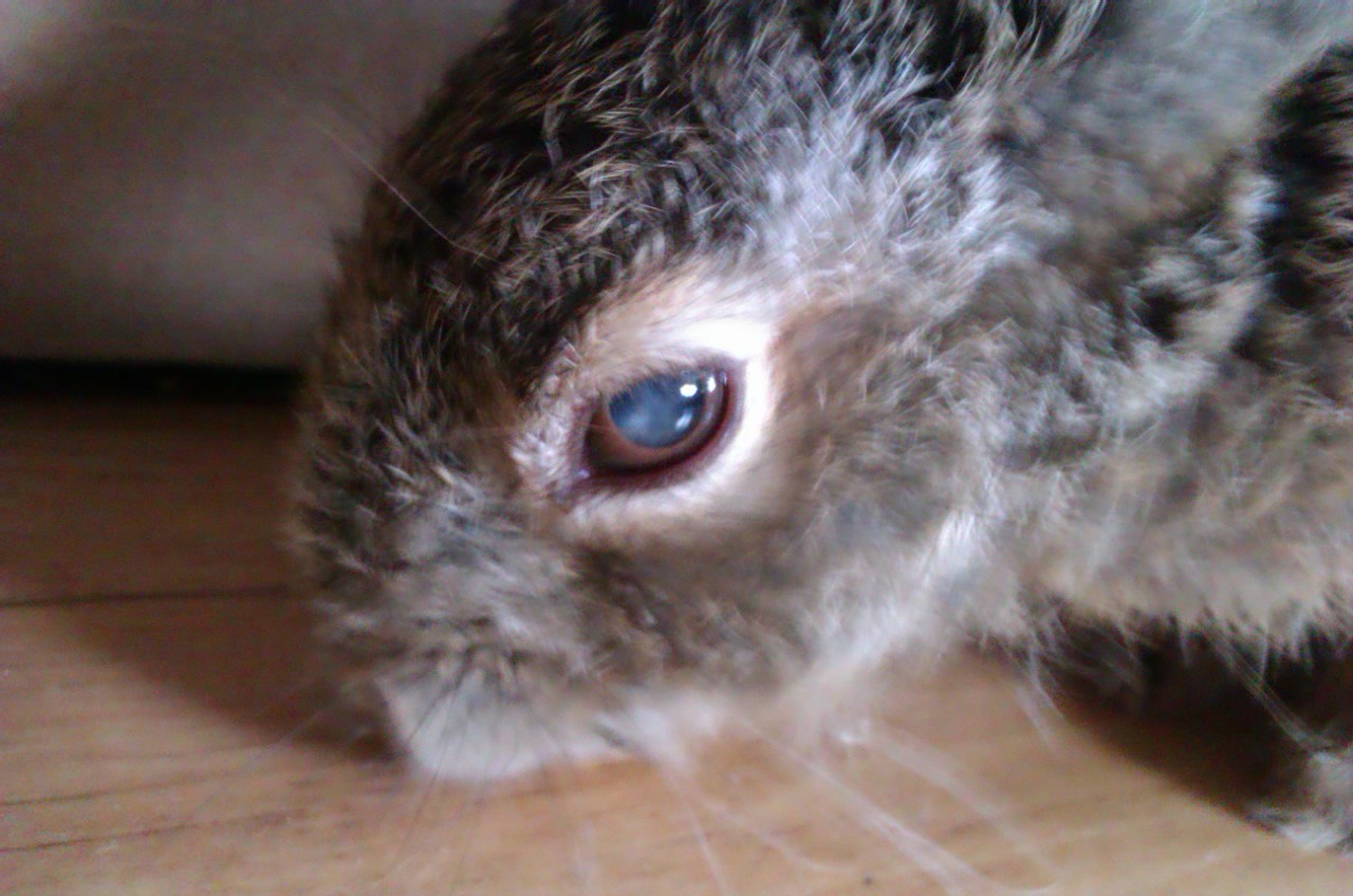 Mezitím jsem kontaktovala několik veterinářů specializující se na drobné savce, kteří se shodli, že se jedná o zákal čočky a nelze s tím nic dělat, že zajíc sice bude slepý, ale že se bude orientovat podle ostatních smyslů (sluch, čich, hmat). A že jediným řešením by byla operace, která by byla hodně nákladná a výsledek by nebyl zaručený, navíc by tam bylo velké riziko, proto operace nedoporučena.