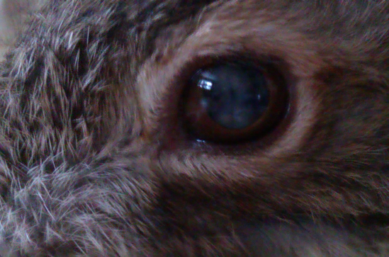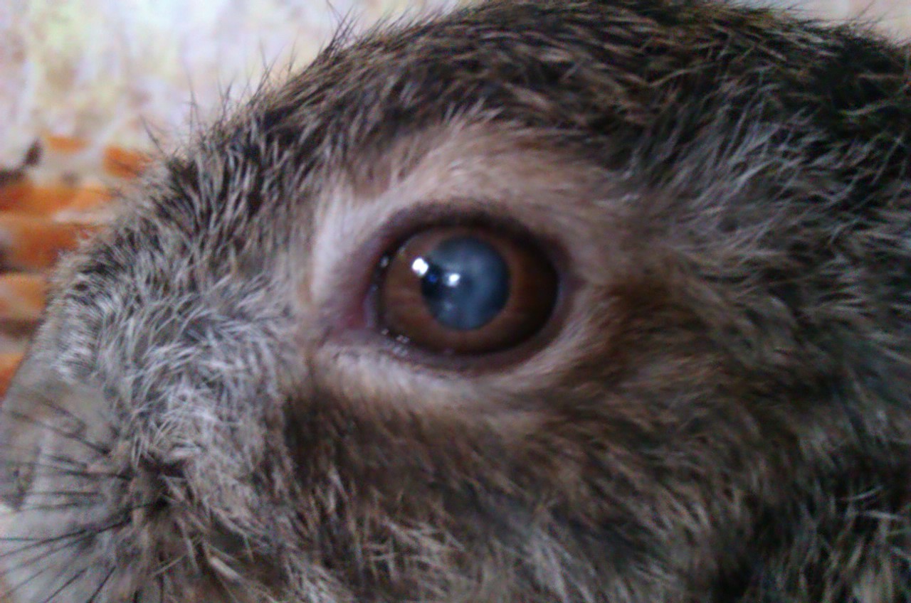No a teď k tomu hlavnímu. Zajícovi se pravé oko, které měl úplně zakalené začalo lepšit a projasňovat. čočka byla úplně bílá, nyní je bílá v horní části, kde tvoří zákal malý půlměsíček. Veprostřed je jen lehoulince zakalená a v dolní části čirá. Je na něm vidět, že mu vrátil z části zrak. Pozoruje pohyby, když k němu přijdu, mě pozoruje. Když ho měl zakalené úplně, tak za zvuky natáčel pouze uši.
