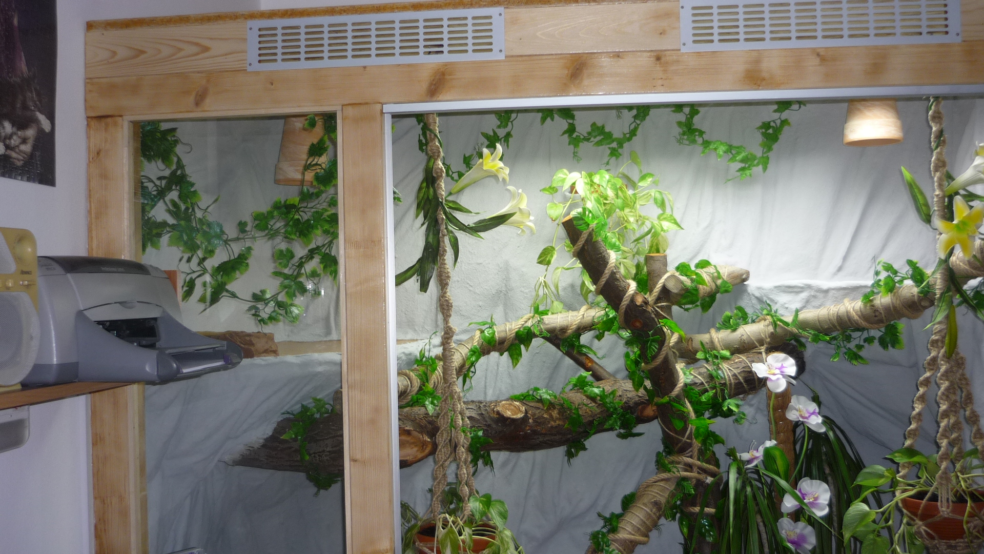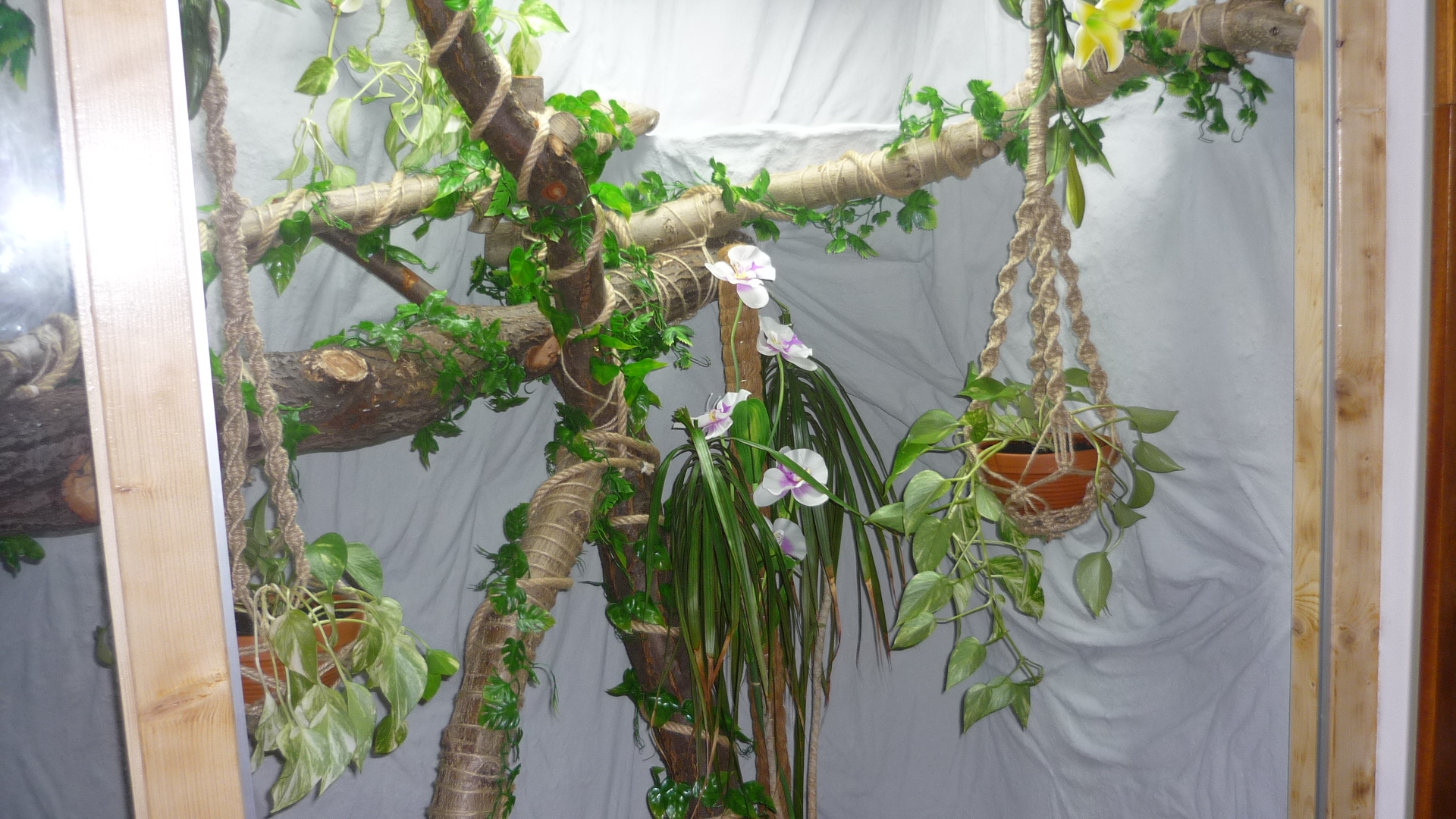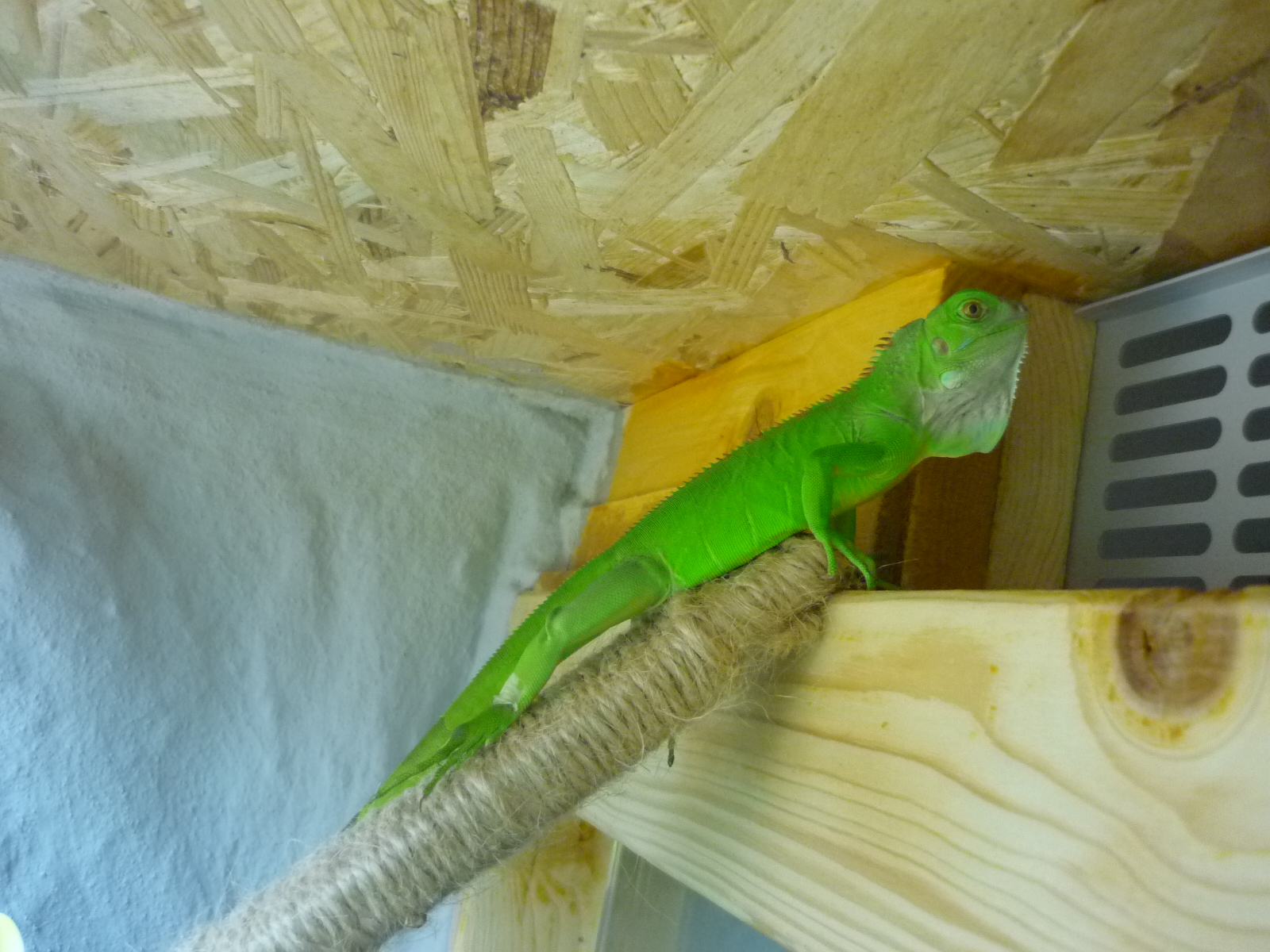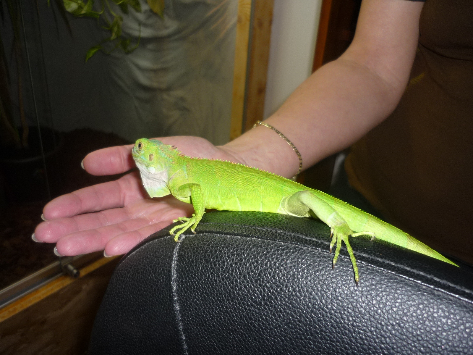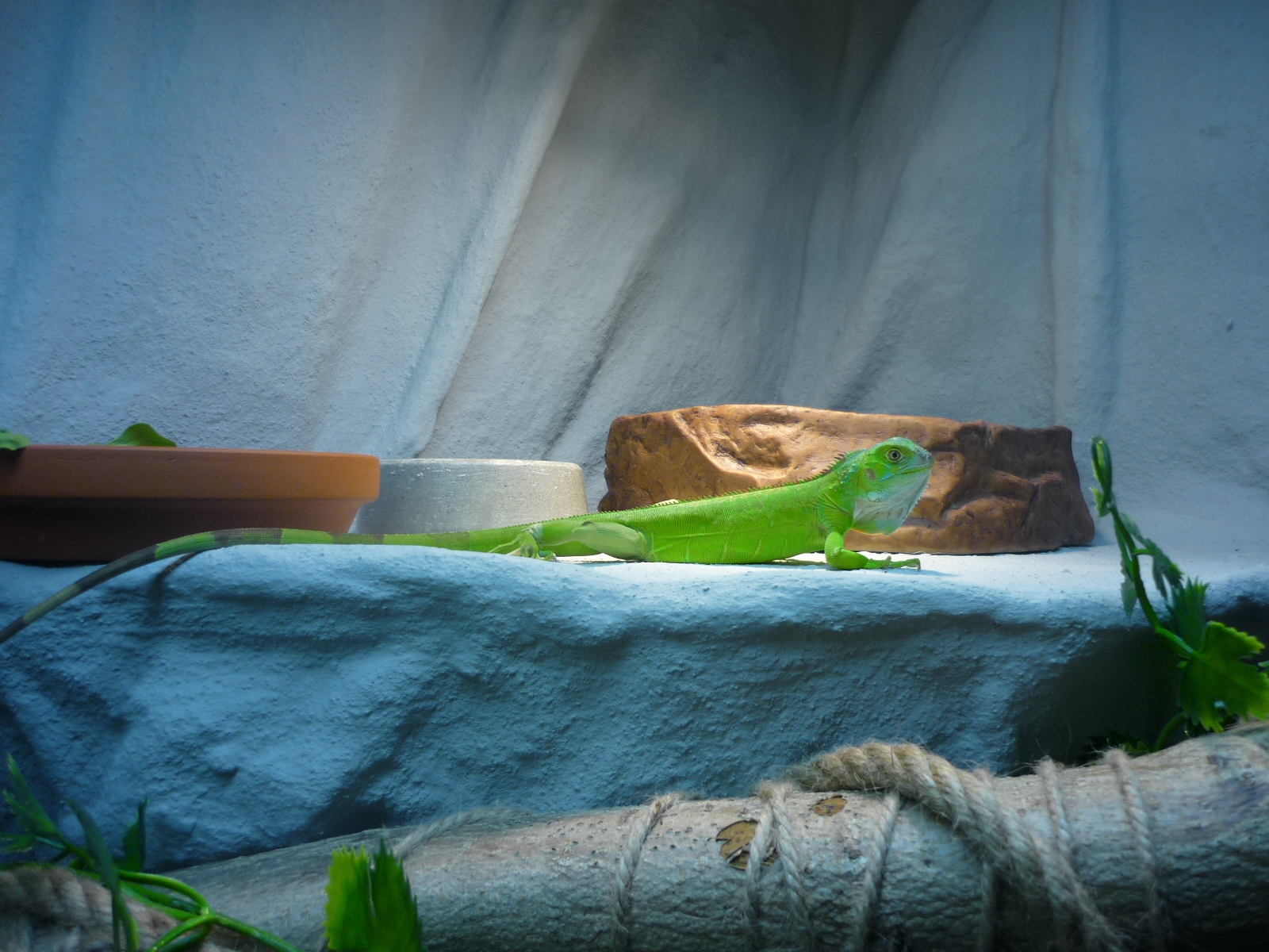Podmínky v teru - 28-30°C, na výhřevu 38°C (ale tam zatím nechodí), ve spodní části teploty okolo 26°C (dolů neslízá - drží se stále ve vyšších místech a květináči nebo větvi. Vlhkost je stále okolo 50 - 70 %. V teru má 4 živé kytky (pothos a dracenu). UVB 10 - kompakt zatím, později, až se "zabydlí" dosadíme výbojku Sun glo 160 W. Síla UVB je prý v pořádku - konzultováno přímo se zřizovatelem Vámi uvedených stránek.