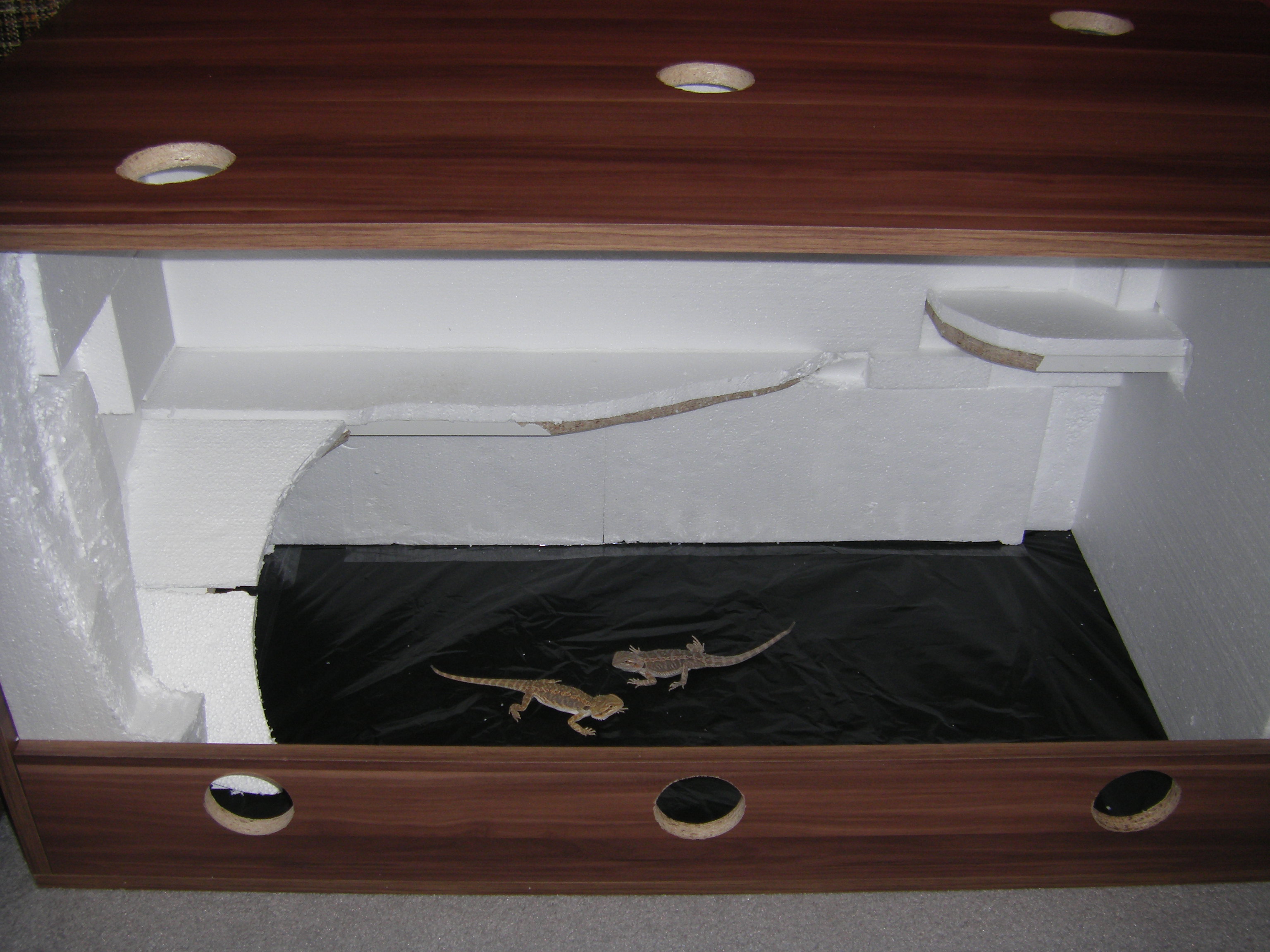 tak dnešním dnem jsem dokončil stavbu terária. Děkuji všem za rady a názory. Terárium je tedy z dřevotřískových desek, obložené polystyrenem s třemi vrstvami lepidla, natřeno Duvilaxem BD20 a posypáno pískem, nakonec přelakováno bezbarvým lakem na parkety (zdravotně nezávadný). Osvětlení je SunLux UV PAR30 s předřadníkem a zářivka.
