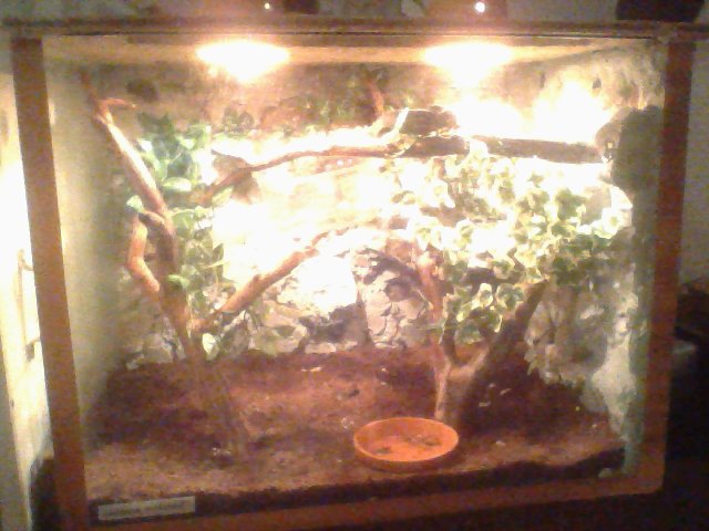 Mám ho v prozatimním teráriu dělám pro něj větší s lepším větrání vodopádem apod.. Teplota: 29-31 stupňů. Světlo UVA a UVB jsem měla staré takže jsem objednala nové má přijít do týdne. Foto dodám do půl hodky :)