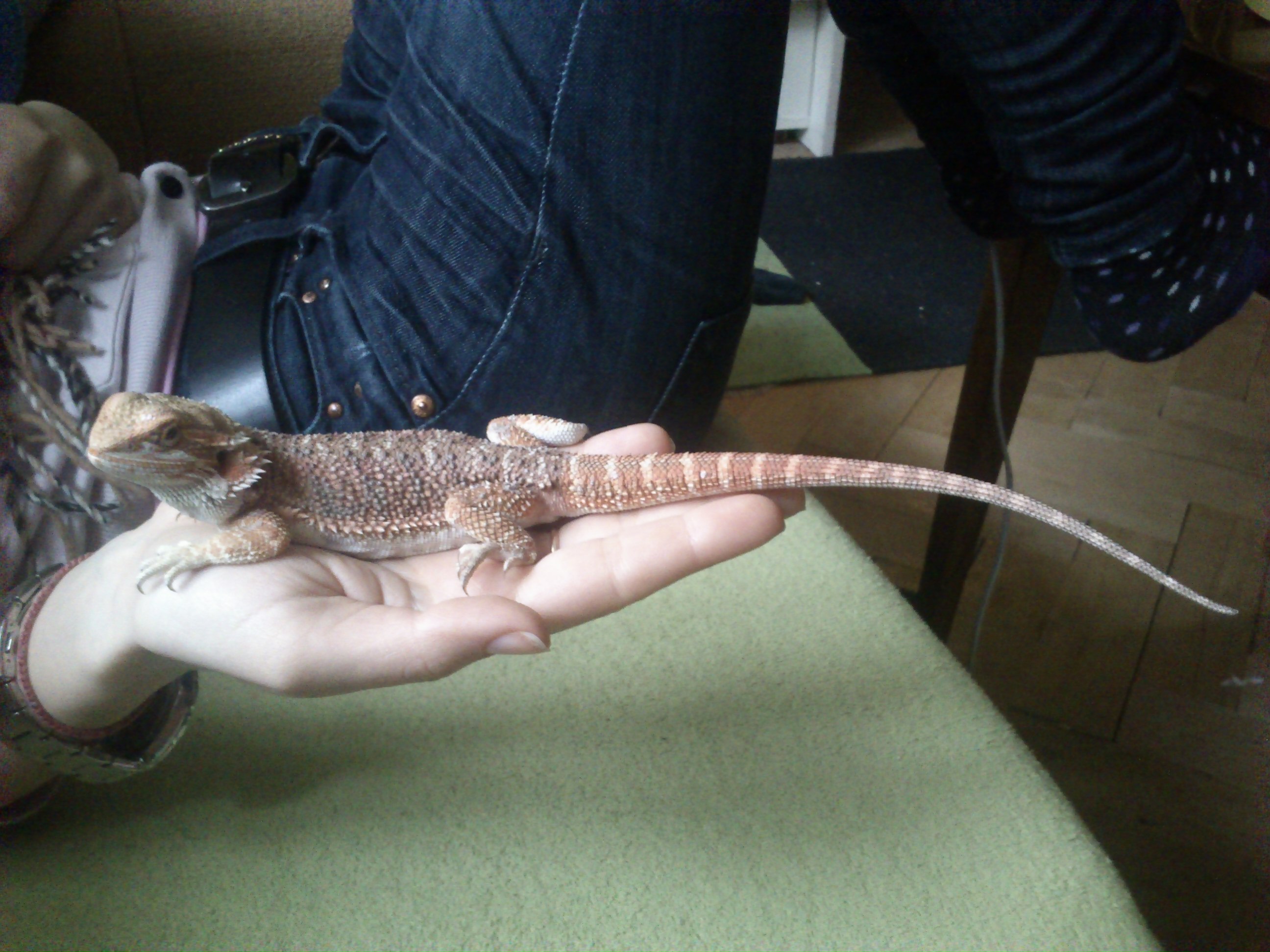 Dobry den,dneska som si zakupil samca Agamy bradatej a chcel by som Vas zabehnutych poprosit o radu k chovu.Agama ma priblizne okolo 4-5 mesiacov,meria cca 25 cm-v tele cca 7 cm v terariu zo skla s rozmermi 75x45x45 s 3D pozadim s UVB svetlom Reptil Glo 10.0 26W a obycajnou 40W ziarkovkou na vyhrevnu funkciu..Dnes este nechce zrat,je prvy den v novom terarariu a skor oddychuje na mieste a zaspava,tak to moze byt tym? Planujem krmit hlavne svabmi,potom svrckami a zeleninou a ovocim..Dalej sa chcem spytat ci Agamam vadi ked ich ludia vytahuju a beru na ruky,resp ked si ju zoberem raz-dva krat za den a dam ju pobehat po gauci ci ju to nebude otravovat?Co rosenie?ma tam misku s vodou a chcem jej davat tak kazdy druhy den dake ovocie alebo zeleninu?staci jej to alebo treba aj rosit?kazdy den?,popripade ci je dobre ju kupat?A co vitaminy,poradte mi prosim neake overene popripade link kde kupim za rozumnu cenu? Pripajam fotku teraria A chcem sa spytat ci treba dokupit aj vyhrevny kamen,popripade daky konar na lezenie a ci by ste nieco zmenili? Vopred velmi pekne dakujem.