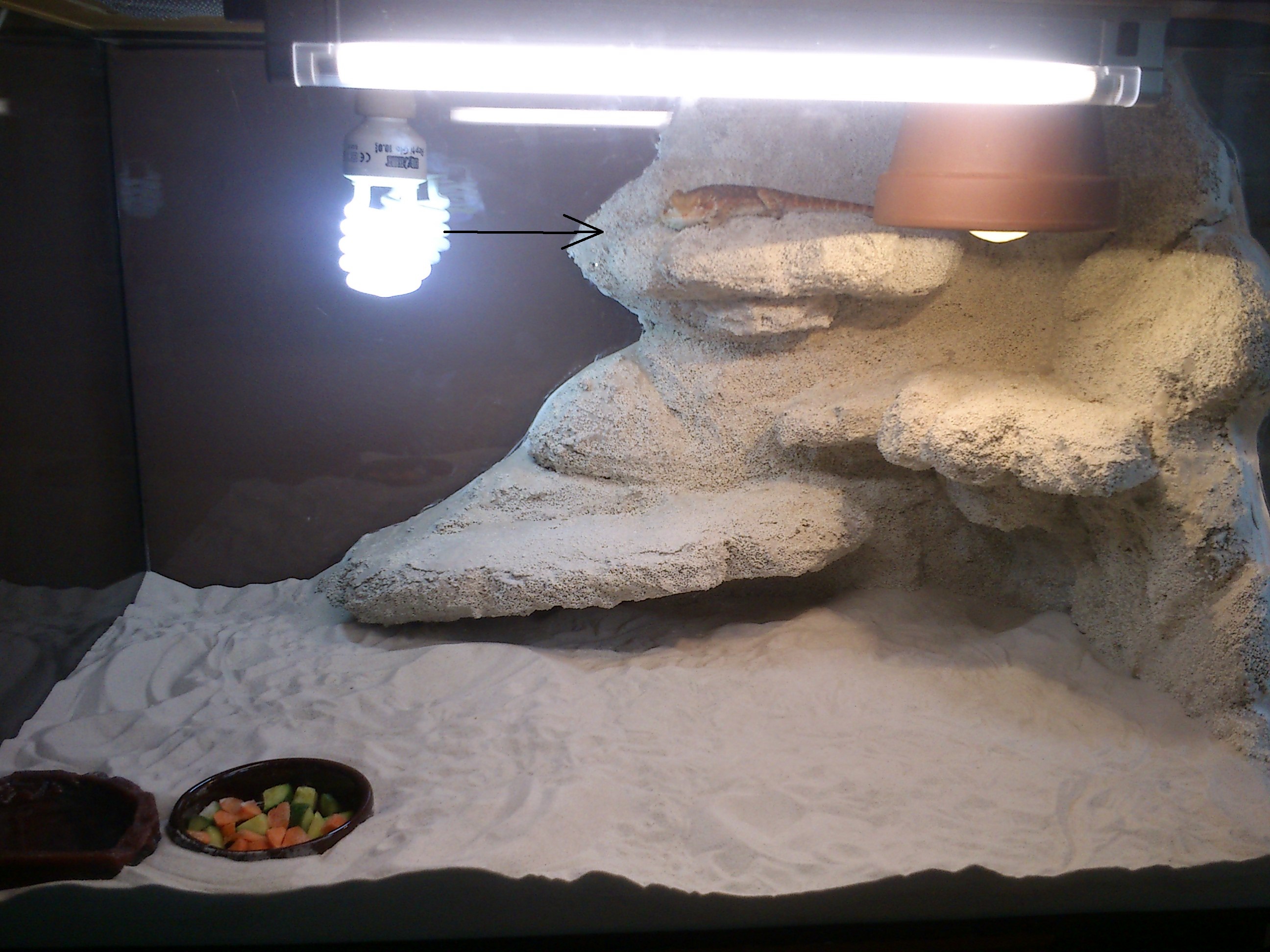 piesok som uz kupil obycajny detsky..zavesim sem este fotku strechy teraria+tam vyznacim kde som este rozmyslal ze by som dal vetranie..ci by to mohlo aspon trochu pomoct?a este jedna fotka celeho teraria kde som dokupil jedno linearne svetlo,chcem sa spytat ci uz podla toho co vidite na fotke ma agama dost svetla v terariu+ som tam zakreslil kam chcem posunut RG 10.0 UVB 26W,ci tam nehrozi ked nemam ziadny kryt okolo ziarovky ze agama bude vymyslat a popali sa.ta ziarovka by bola od nej na dosah asi 3-4 centimetre.zatial dik