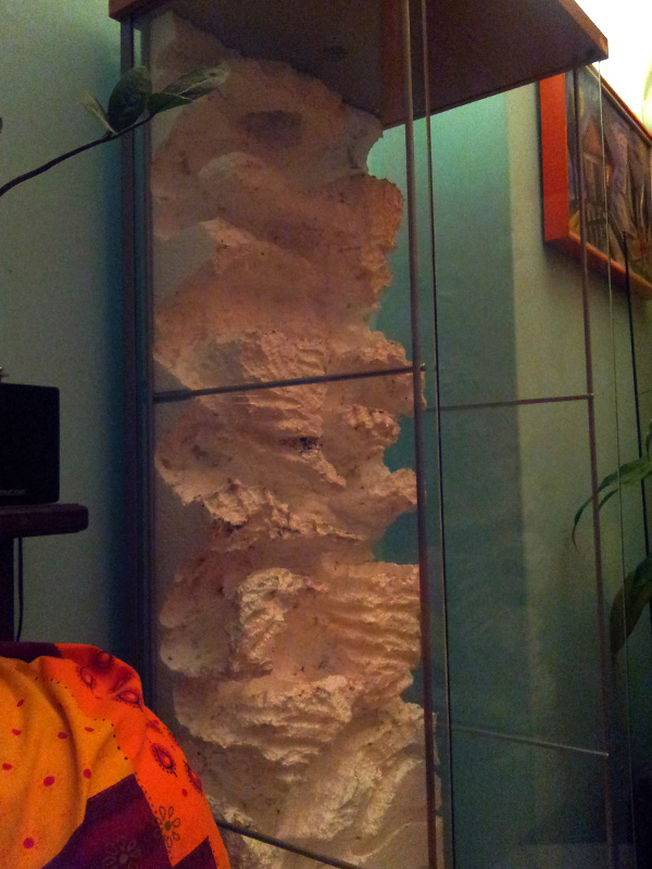 Dobrý den stavím pro ciláty nové a větší terárium (viz foto), a potřeboval bych poradit, teď už jsem před koncem tvarování pozadí s polystyrénu (20cm tlustý, technika vypalování pájkou) a otázka zní jestli můžu rovnou na polystyrén nanášet flexi stavební lepidlo na obklady a nebo to nějak vytvrdit aby to nepraskalo. A pak ještě nevím čím to mám tónovat a barvit aby to vypadalo co nejlépe (chtěl bych dosáhnout větší barevnosti a věruhodnosti jako pravá „skála“). Hodně jsem o tom četl a pro ciláty bych chtěl spíše hladší povrch kvůli jejich „povrchu nohou“ (asi technika posypu písku odpadá). Dále nevím jestli tónovat rovnou flexi lepidlo nějakýma pigmentem a pak to přetřít matným lakem, nebo použít Balakryl a ten tónovat pigmentem a pak lak. Nebo Lepidlo na dlaždičky pak vrstva epoxidového lepidla pak nějaká barva a barevné varianty a přetřít to matným lakem. V pozadí mám udělané i kapsy pro budoucí rostliny (nevím jestli tam nechat jen přírodní polystyrén nebo to taky polepit a natřít? A udělat tam i odvodňovací dírky je asi jasný). Budu rád když se podělíte o své názory a předem díky.
