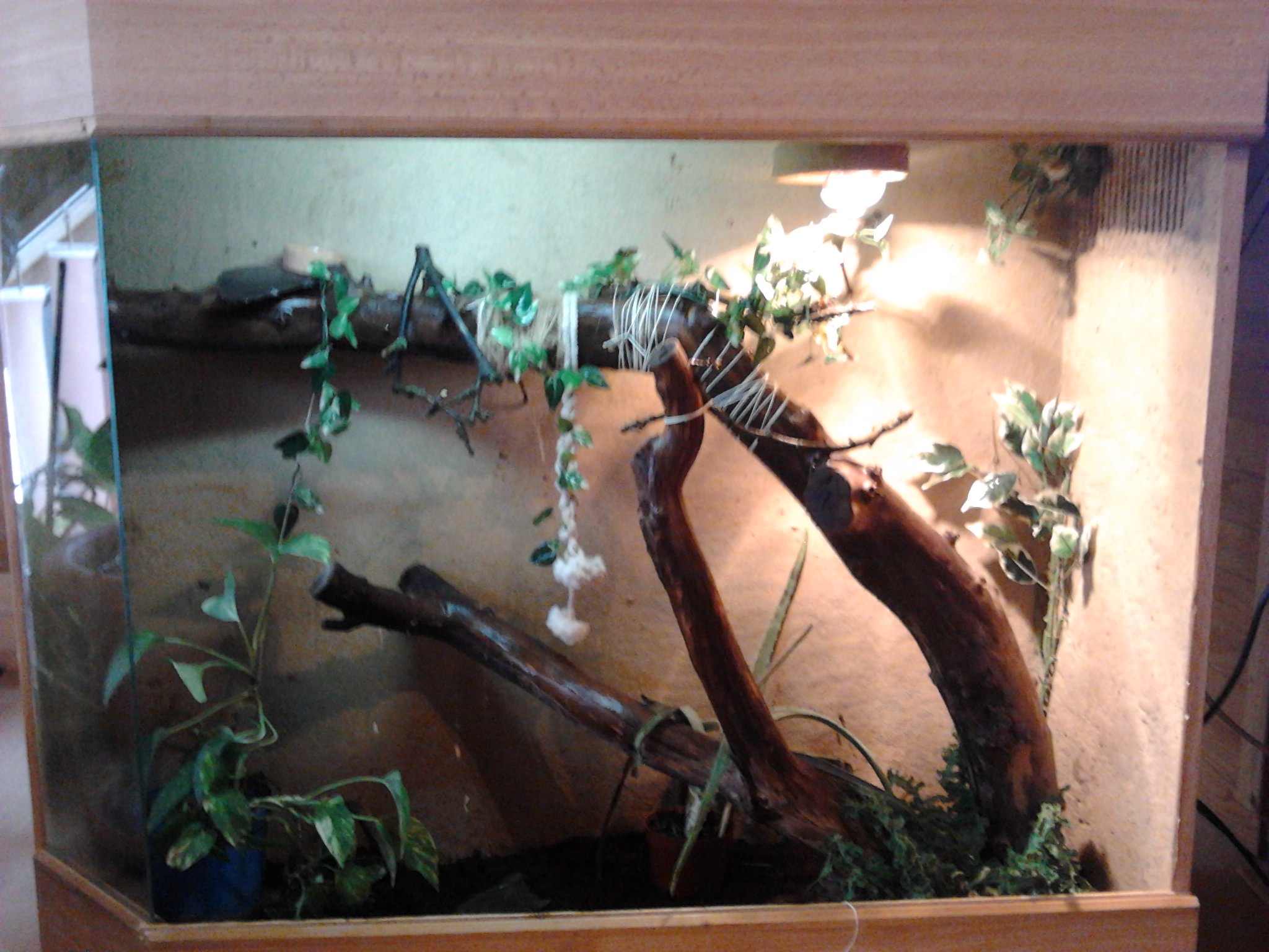 2. Jak máš řešeno větrání? Z fotky to není moc zřejmé. Máš nějaké větrání i u dna? Chameleoni jsou na větrání velmi citliví. Doporučuje se větrací mřížka přes 1/3 stropu a vetrací pás právě i u dna, tak aby v teráriu proudil vzduch a nezatuchával.