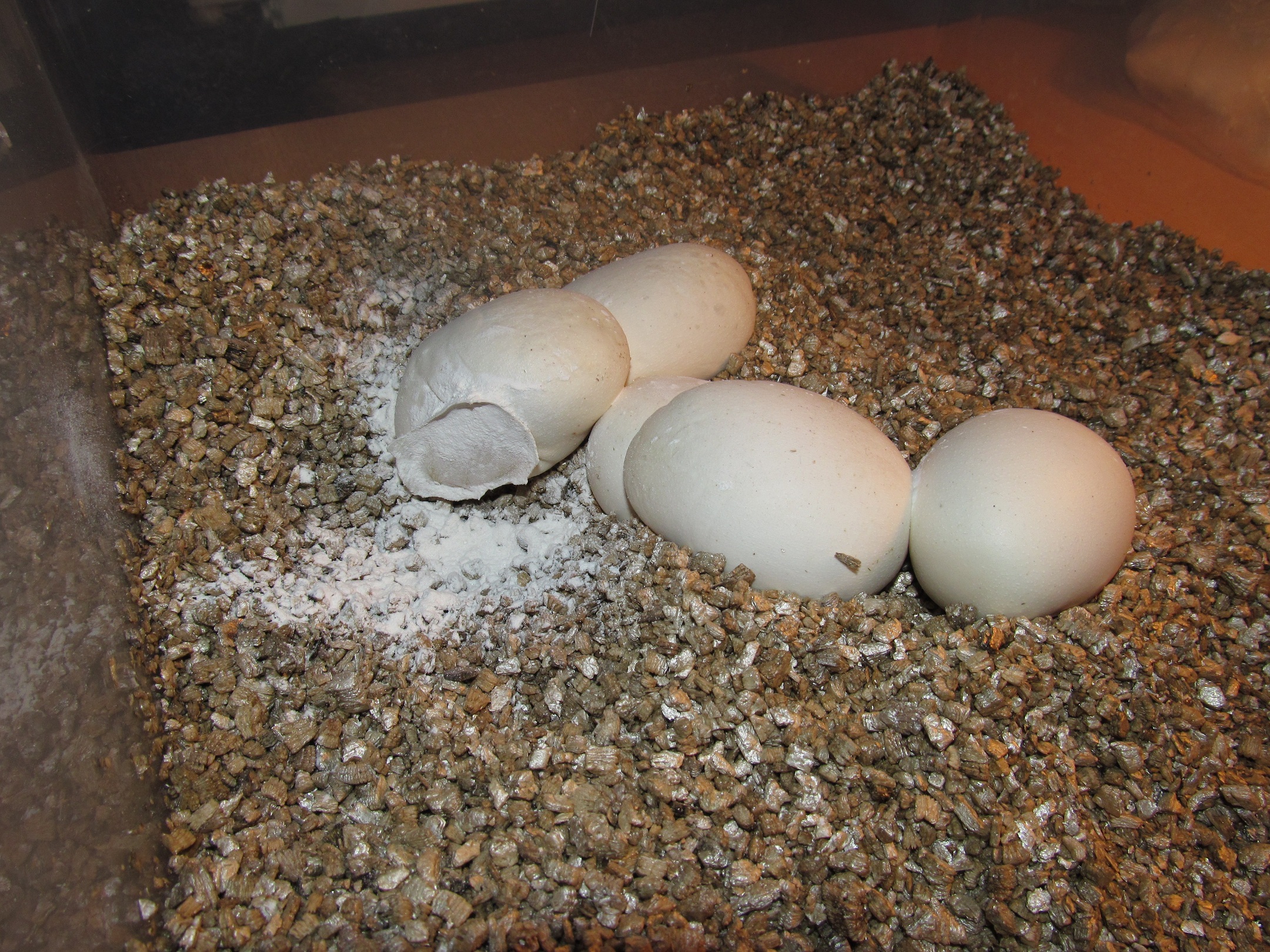 4) Kousek zkaženého vejcete jsem musel nechat přilepený na zdravém. Teď přišel čas otřít zbylé kapičky tekutiny, která z vejcete ještě dodatečně vytekla, a zasypal jsem okolí hustou dávkou Devilanu. Okolí vejcete jsem pro jistotu nezahrabával do vermikulitu. Celkový čas operace bych tipoval kolem 3-4minut.