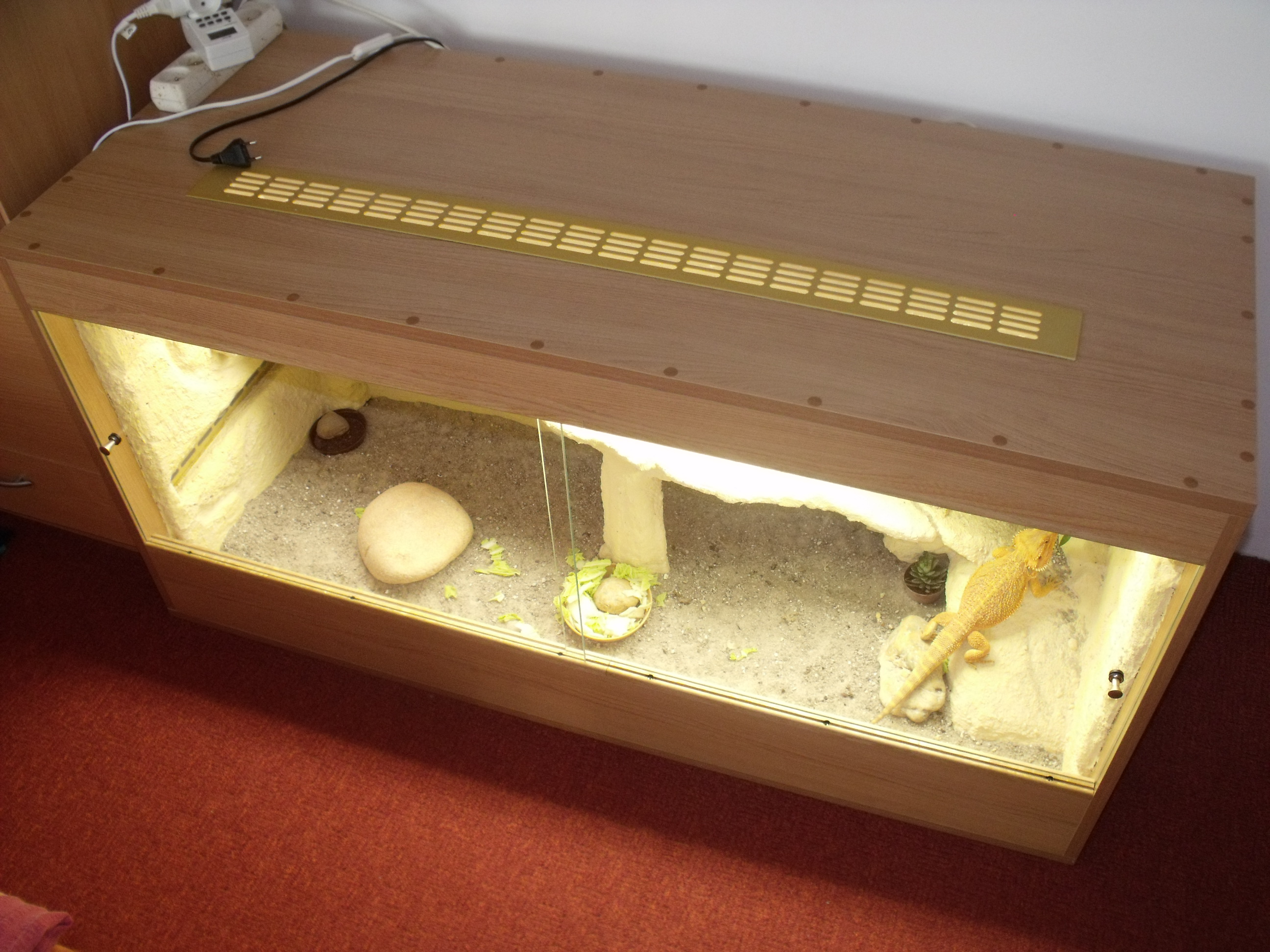 Už sem psal MadMikovi na obchod, ale než odpoví, optám se ještě tady. Hledám nový zdroj UVB záření do terária 135x55x50 pro vousatky (viz. příloha). Momentálně nemám peníze na předřadník a kompakt se mi už taky kupovat nechce. Dobrým řešením se mi zdála zmíněná výbojka. Zajímaly by mě její výsledky co se UVB podílu týče (nemá někdo informace ? ).