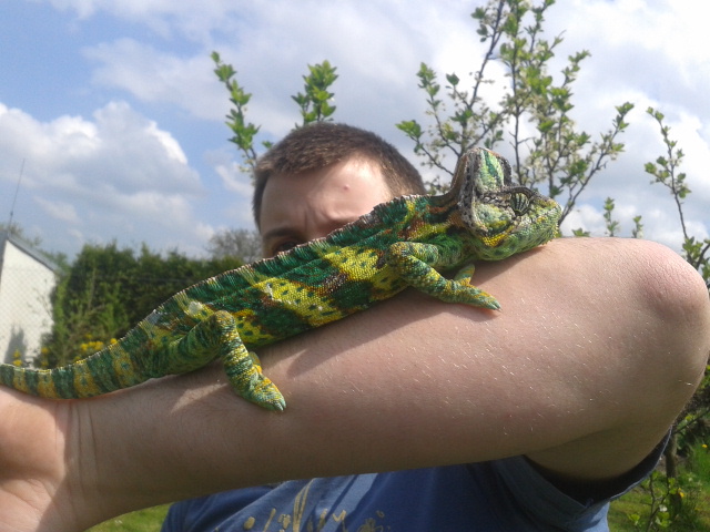 A dost možná ti nežere kvůli stresu z nošení ven. Jsou to stresáci a pokud ho bereš do neznámýho prostředí, zasekne se ti a žrát nebude. Na to se vybodni. Sluníčko je sice perfektní a nenahraditelný, ale raději v pokoji, který chameleon zná, za otevřeným oknem.
