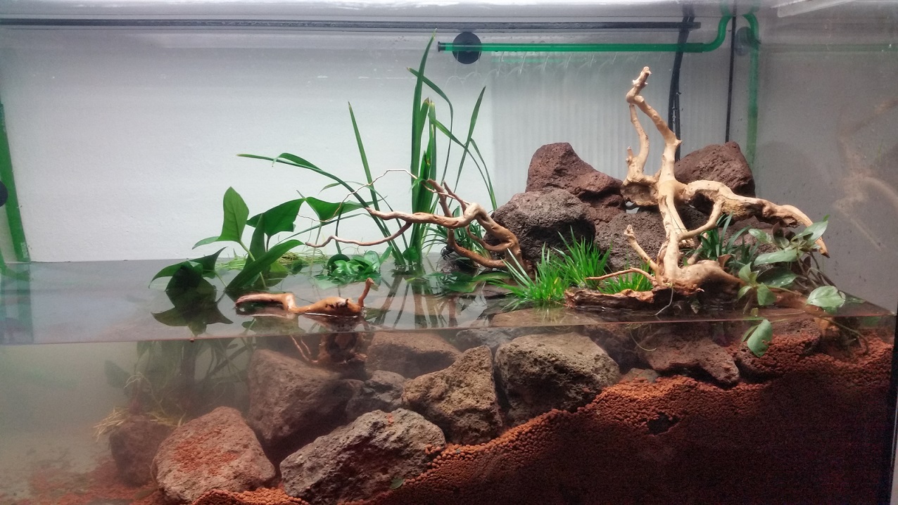 EDIT: jen doplním, že "souš" by byla z rašeliny a osázená rostlinami typu Ficus pumila, "blázen", břečťan, mechy, a zkusila bych tam zasadit i emerzně Anubias barteri, Cryptocoryne affinis a Hydrocotyle tripartita.