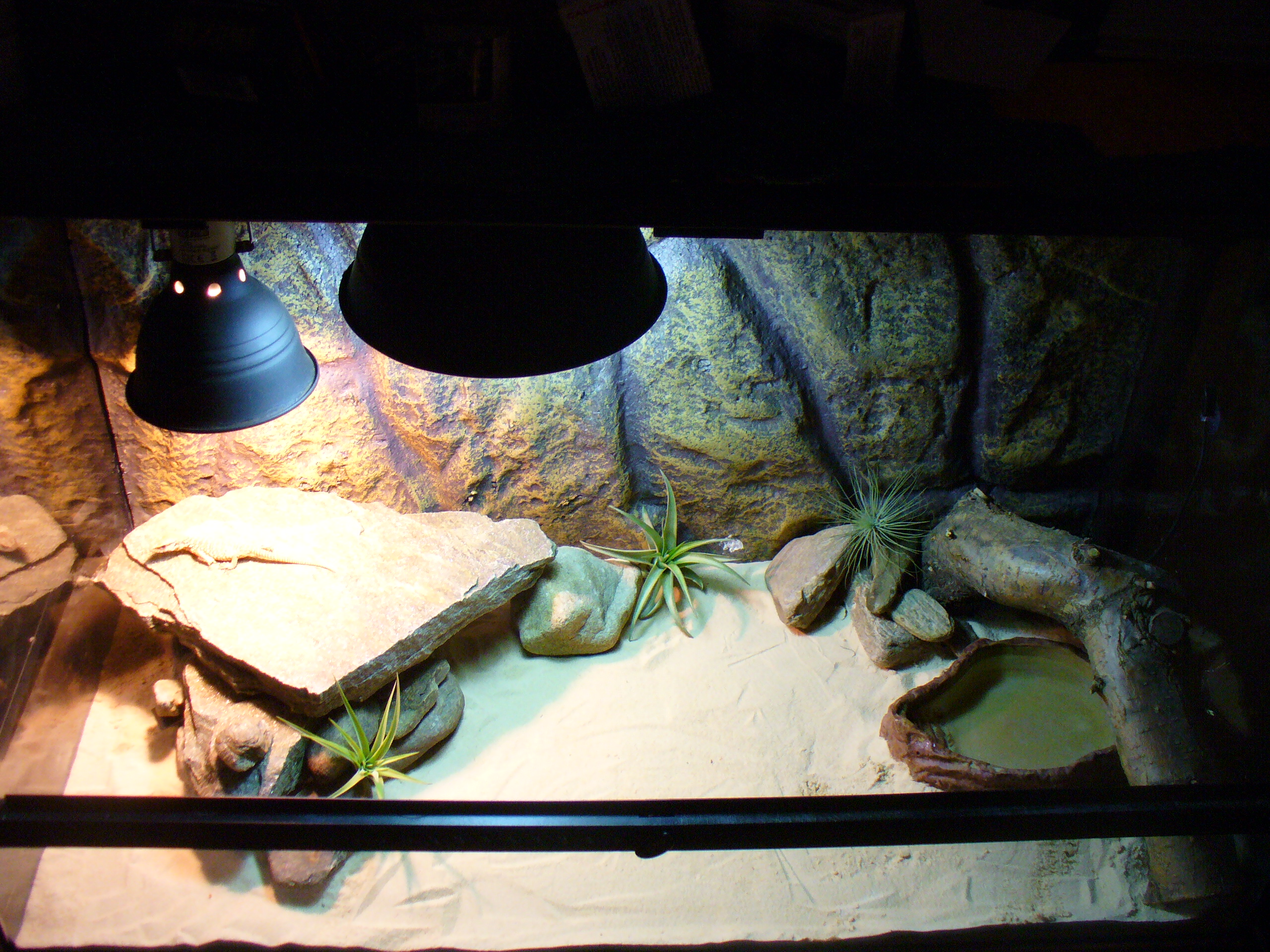 Chtěl jsem se optat jestli takhle jednoduše vybavené tera bude stačit. Je to 90x45x60(jak bude větší stěhuje se do většího. Žárovky jsem mu tam dal dvě. Jedna na teplo - Day glo Tight Beam 50w(na kamenu pod žárovkou je 43C). A ta druhá na UVB - Repti Glo 10 UVB 26W. Mám možnost mu tam přidat nahoru zářivku 40W pokud nestačí to co tam mám.