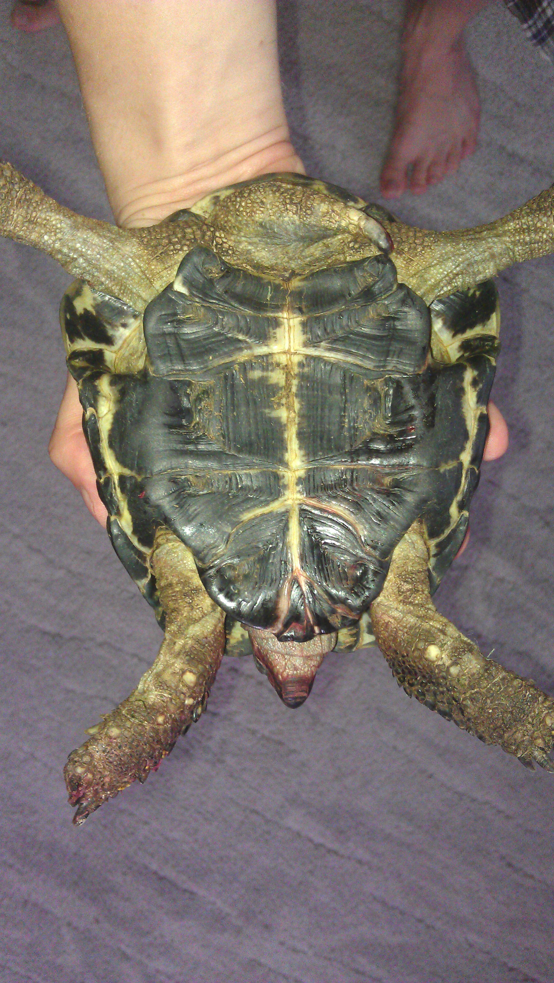 Druh tu určitě někdo pozná, na zoban kleštičky bo stranové štípačky (nejlépe půjčit od pedikérky, ty maj ostrý).Bo dobrej vet., bo zkušenej želvař z okolí.