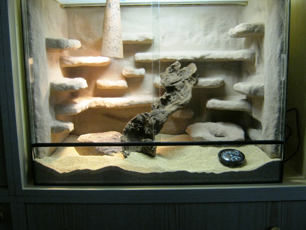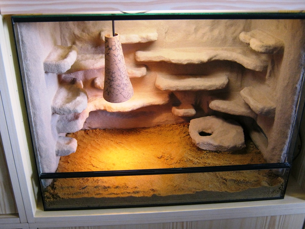 Tak prisel pisek a libi se me moc. Je perfektni a hlavne nespini. :-D Ted ještě špekuluju s tou teplotou. Je tam 25w bodovka a na tech plošinkách je kolem 45 stupnu, na sutru dole kolem 40 a tam jak je teplomer na fotce je 25stupnu, coz bude asi idealni, ale u te zarovky to je asi moc co? Jinak ještě tam dam misku na vodu a misku na vapnik s vitaminama a 2 pulky kvetinacu jako ukryt. Btw neznate nejakej figl jak ten kvetinac rozpulit? Me se to dlatem a kladivem nejak nepovedlo. :-[