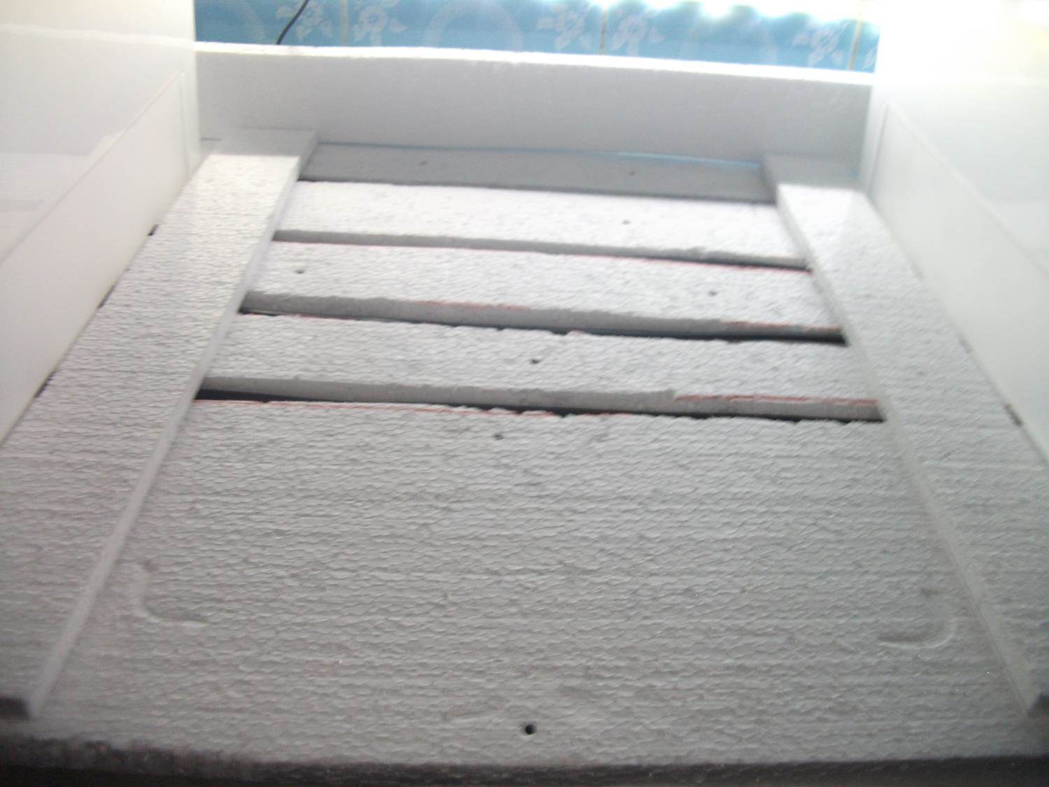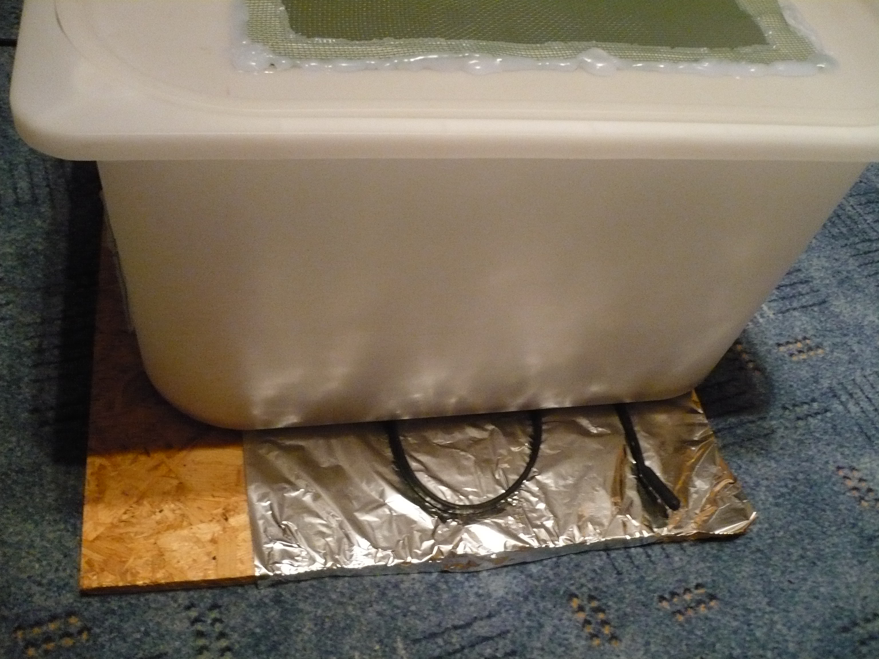 Na poličce je alobal a na tom je ve smyčkách topný kabel (7m, 50w) napojený na termostat. V mezerách mezi kabelem a okolo je centimetrový polystyrén (stejně tak do třetiny výšky boxů zezadu a na bocích). Na tom už jsou jen boxy.