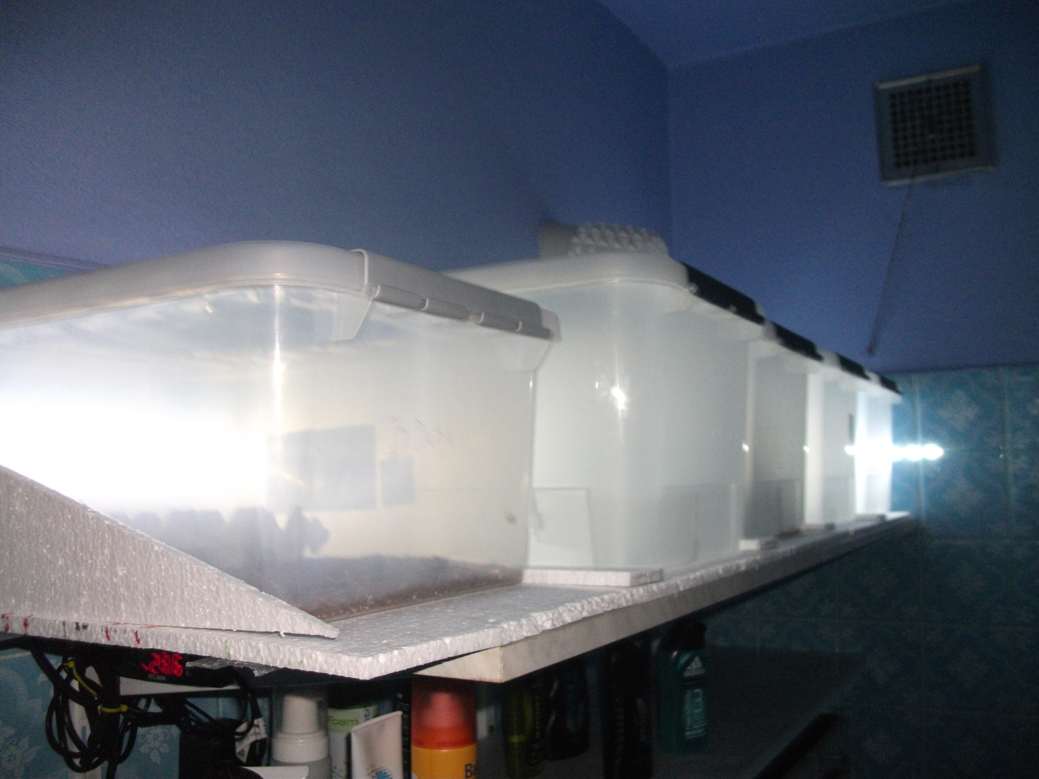 Tak jelikož my v úterý došli nové boxy (clip boxy, 30x40x25- šxhxv)na šváby tak jsem se rozhodl rovnou předělat celý chov. Boxy jsou v koupelně na poličce 150x40 (vytápěná část 150x30 pod místo s krmením jsem schválně nedával topný kabel).