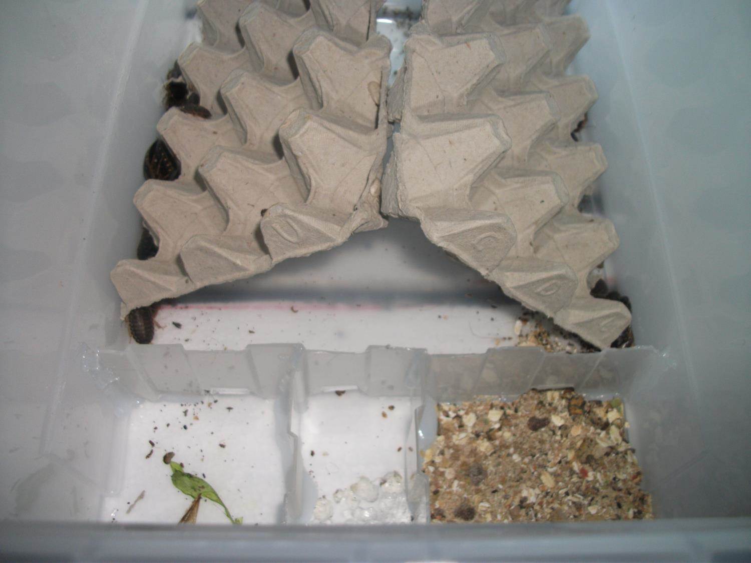 mám cca 250 těchto švábů v plastovém boxu 40x25x18, box je na terárku teplota přes den cca 27-29°C, v noci kolem 20-22°C. Box zařízen bez substrátu, pár proložek od vajec, 2 misky, v jendé mix otrub, krmení pro rybyčky (ty lupínky) a granulí pro kočky + se mi v boxu válí suchý rohlík.V druhé mám vždy čerstvé okurky aby měli vodu. Měl bych 2 otázky :).