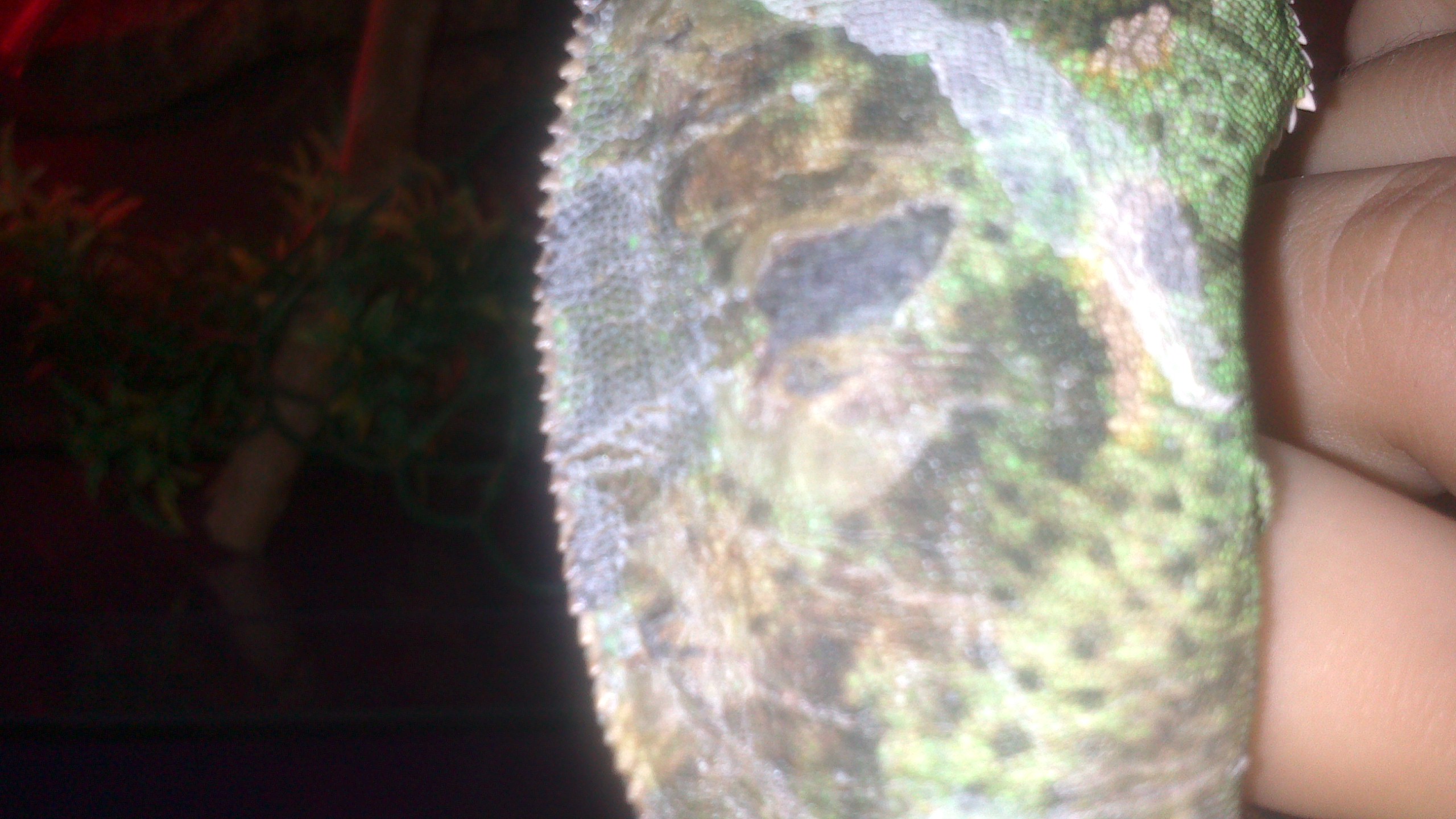Chudák chameleon... spálená odumřelá kůže. Na fotce je vidět výhřevná horká červená žárovka která ani není pro chamelóny taže že by zdroj popálení? + to přehnanné rosení takže okamžitá infekce a plíseň. Prosím vás než si koupíte takové zvíře, zjistěte si o tom něco než jej takhle drasticky trápit!!! Bohužel chameleónkovi se kůže do původního stavu nenavrátí...