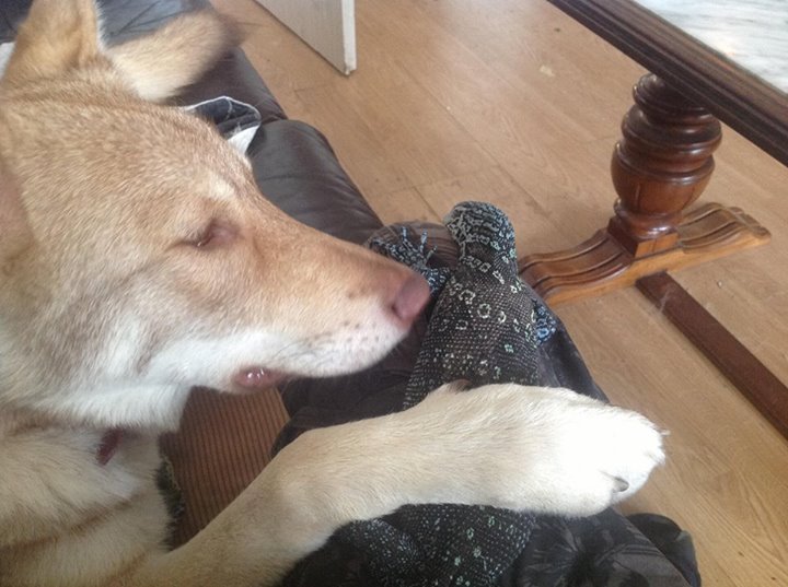 Na fotce je Saarloos 1.0 a Varanus macraei 0.1 a jsou spolu velmi v pohode..