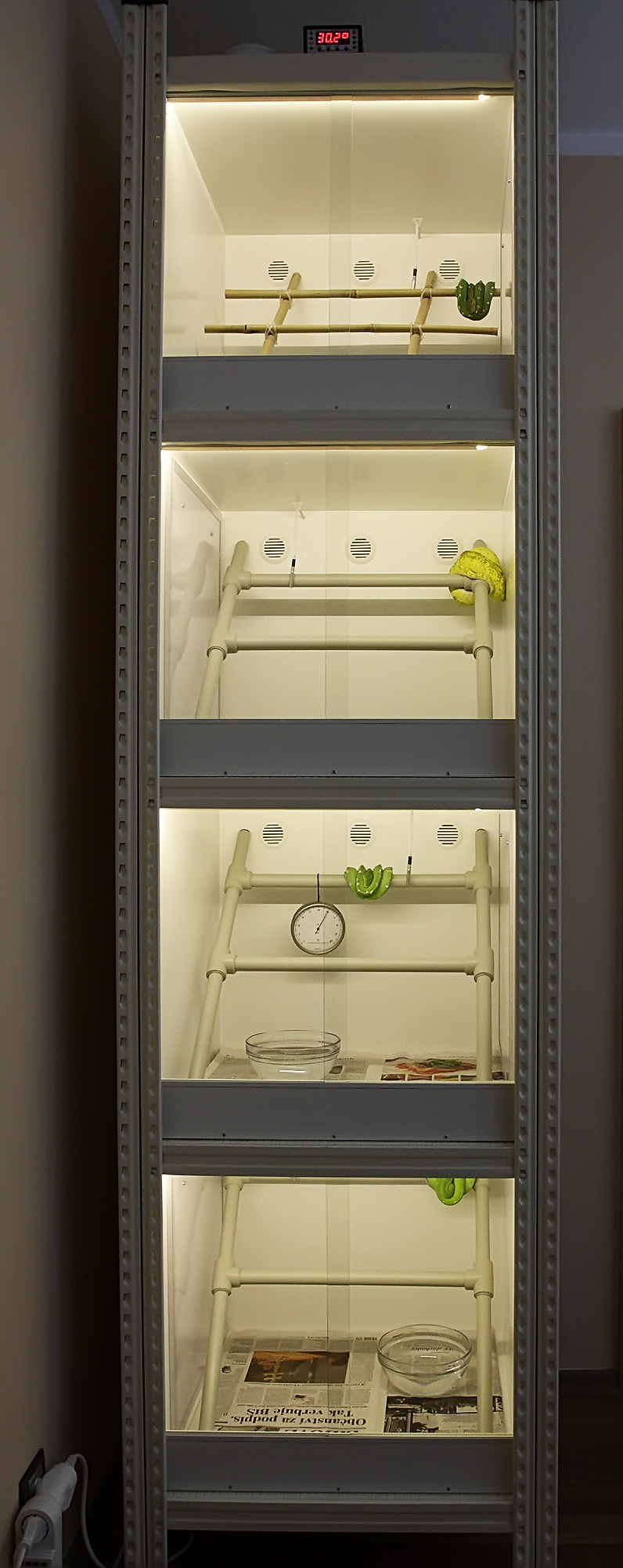 Jj, je to bílý lamino tl. 18 mm. Větrání zepředu dole a vzadu na stropě. Přemýšlel jsem, jestli si nechat vyrobit "věž" a nebo jednotlivý terárka a stavět na sebe a nakonec jsem to kvůli nějaký jednodušší manipulaci s nima udělal takhle. Ono přeci jenom to lamino není nejlehčí a já se svojí postavou kulturisty teoretika bych mohl mít s nějakým přemisťováním problém. Mám na sobě tři. Jinak rozměry jsou cca 60x60x60.