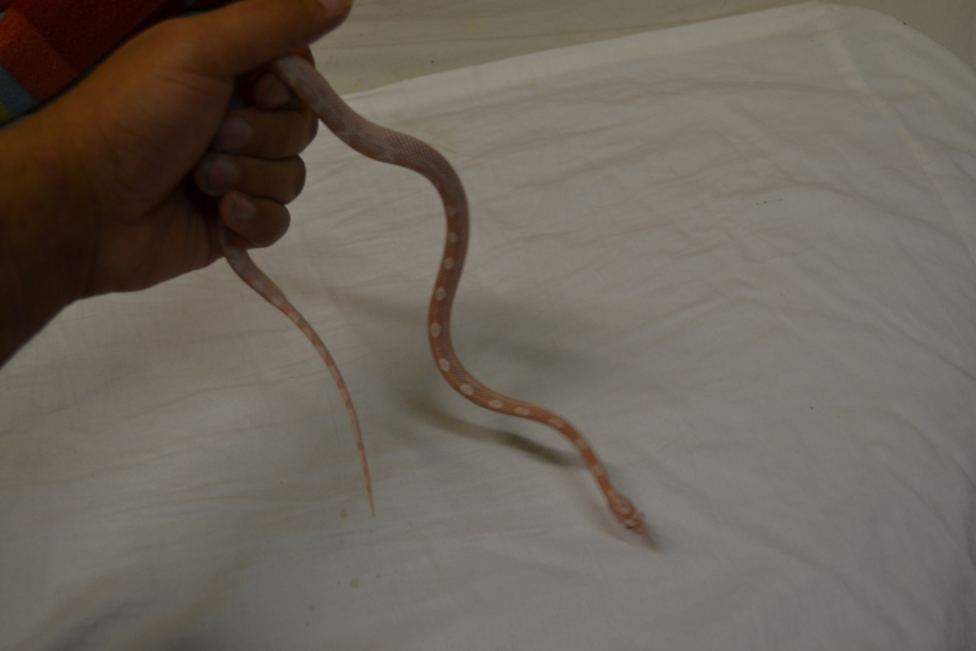 Zdravím, využiju tohle téma. 3 týdny zpátky se ke mě dostala guttka, kterou mi daroval známý. Problém je následující: Měla by být roční, ale přijde mi dost podražená, když vyjdu z toho, že užovky co jsem choval, v jednom roce už obvykle zvládaly skákavky. Od tý doby, co je u mě, dostala každej víkend jednoho špeka, bez problémů ho pokaždý vzala. Podle předchozího chovatele dostávala údajně jedno holátko každý týden, občas 1x za 14 dní. Nebylo by dobrý jí nějakou chvíli (než doroste do skákavek) dávat třeba potkaní holata místo myších špeků? S podraženym hadem jsem se abych pravdu řekl ve svym chovu zatim nikdy nesetkal (nebo si to aspoň myslím). Přikládam foto užovky, sorry za kvalitu, je to dost živý zvíře. Jo, a palpoval jsem ji - je to kluk jak víno.