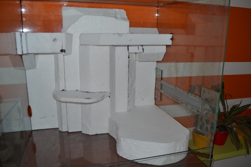 ). Jinak jsem jel klasickou cestou vyroby. Polystyren,tlouska 3 cm, jsem pomoci noze a svicky vytvaroval do pozadovane podoby,dolepil herkulesem plosiny (ty jsem jeste pojistil paratky) a cele jsem to potrel flexi lepidlem na kachlicky. Nechal zaschnout 24 hod a opakoval. To cele 4x. Finalne jsem to pretrel balakrylem s atestem na detske hracky. Vzhled se mi libi a mam ho uz skoro 5 let a drzi. Jen v miste kam samice pravidelne snaseji vejce,v rohu pod vystupkem, mi to vyskrabali az na OSB desku.