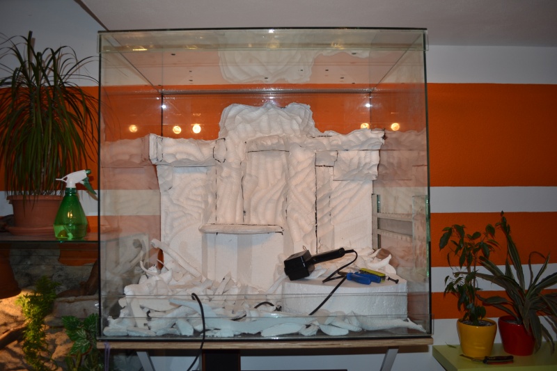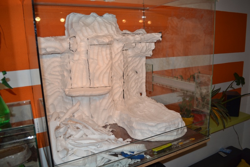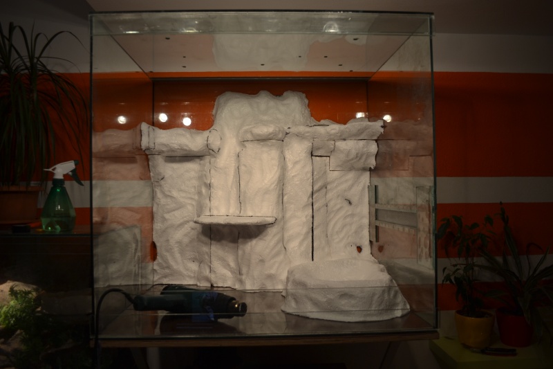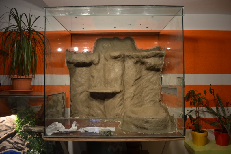 Pozadie momentálne schne od klébru (stavebné lepidlo), je z polystyrénu a PU peny a keďže mám terárko veľkých rozmerov a je dosť ťažké nemôžem ho dať naležato, preto hľadám iný spôsob na nanesenie piesku na pozadie..