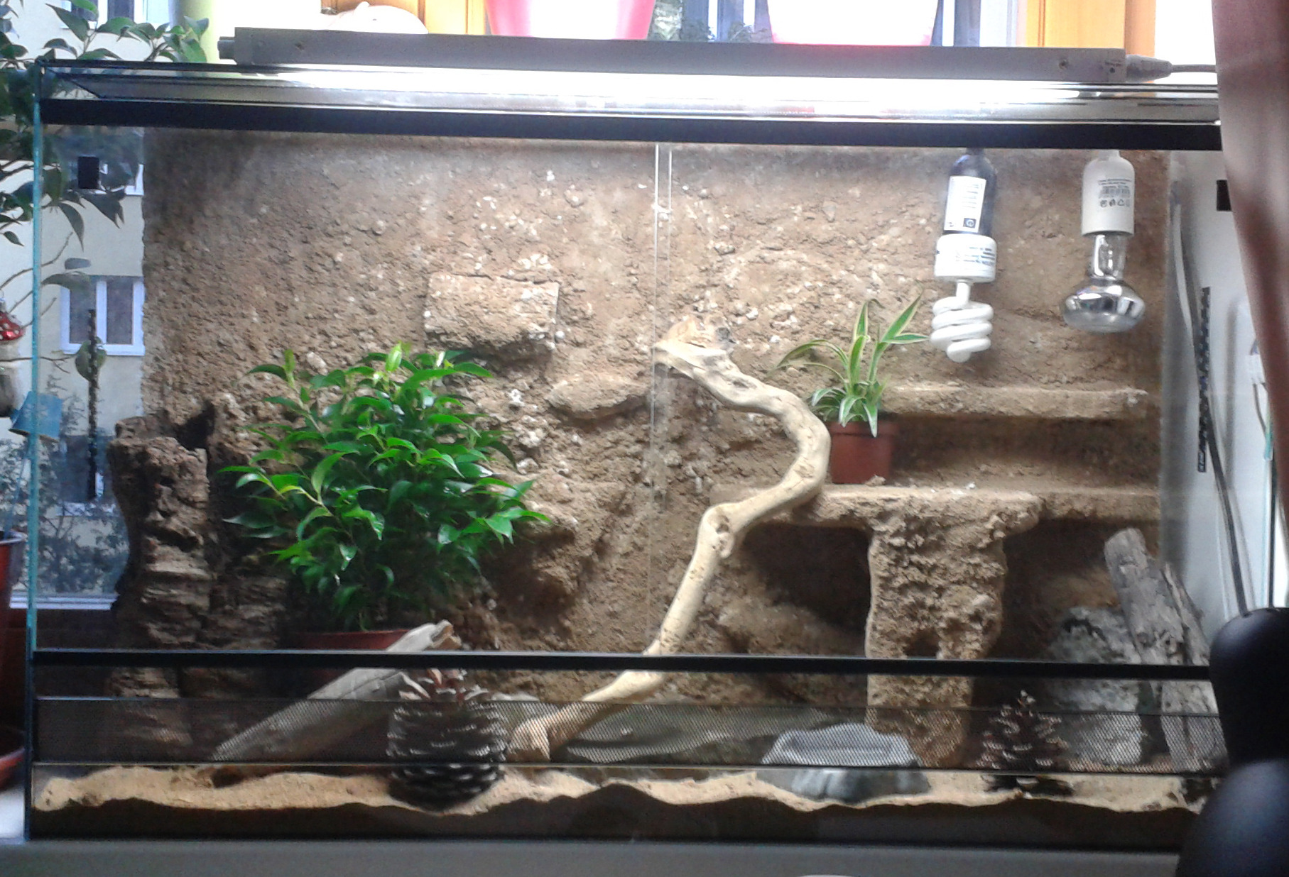 My jsme teď dostavili stěnu a postup lepení písku byl více méně takový, že se první vrstvy nanášely již smíchané s pískem (lepidlo na dlažbu se mi podařilo sehnat v bílé barvě, takže písek tu bílou zabarvil do jemně hnědé a zabarvilo to hezky ten polystyrén) a pak v konečné fázi se dala vrstva lepidla, na to se přitiskla tlustší vrstva písku (teoreticky čím víc přitiskneš, tím víc zůstane) a pak se lepidlo (stále se bavíme o lepidle na dlaždice, ty transparentní další lepidla jsme nepoužili) naředilo tak, aby šlo stříkat rozprašovačem a zezhora se celá stěna postříkala tímhle tekutým lepidlem. Pak tomu dát dostatečný čas zaschnout a ta podstatná část je hotová. Na pozadí taky nemáme stěnu lepenou - nemá sice boky, ale polystyrén, kterým protekla hromada lepidla pořádně ztvrdnul a pak díky dost přesným rozměrům se tak pevně zapasoval do terárka, že jen tak nespadne (a pokud by se pohnul náhodou, tak se nahoře zasekne o vystouplou lištu držící větrání.