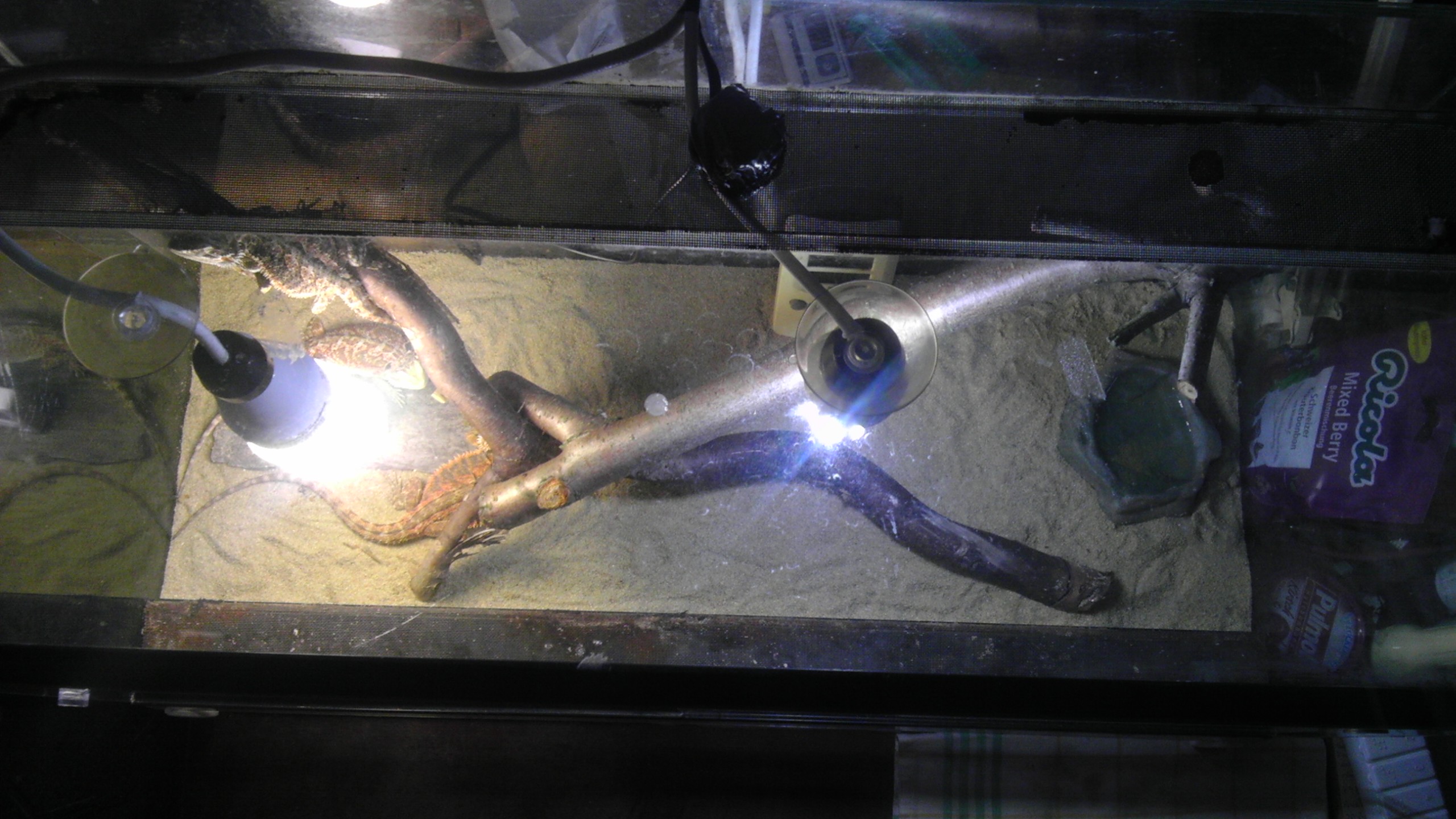 rekl bych ze pisek je tam ten bily akvaristicky, ten bych vymenil za normalni "do detskych hrist", nahoru pridal cim silnejsi zarivku - "trubici" a prozatim to bude relativne OK. Teda - posunul bych bodovku co je vpravo o neco bliz k UV, a sundal bych kryty ze zarovek - uz takhle je videt ze stini tu UV zrovna tam kde ted agama sedi.