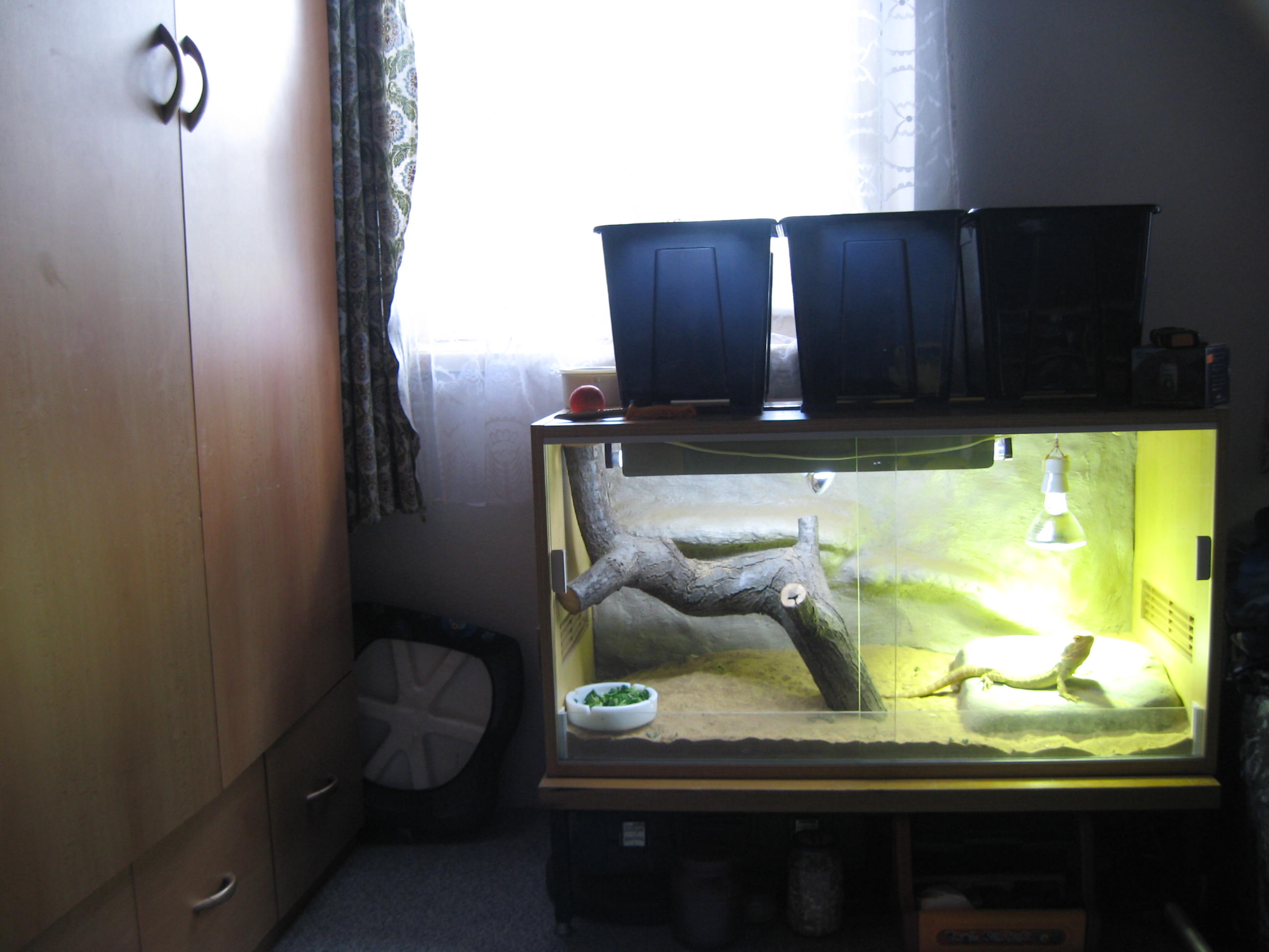 Každopádně terárium se stylu vitrína ta zvířata fakt neocení - chce to aspoň dvě stěny zakrýt.
