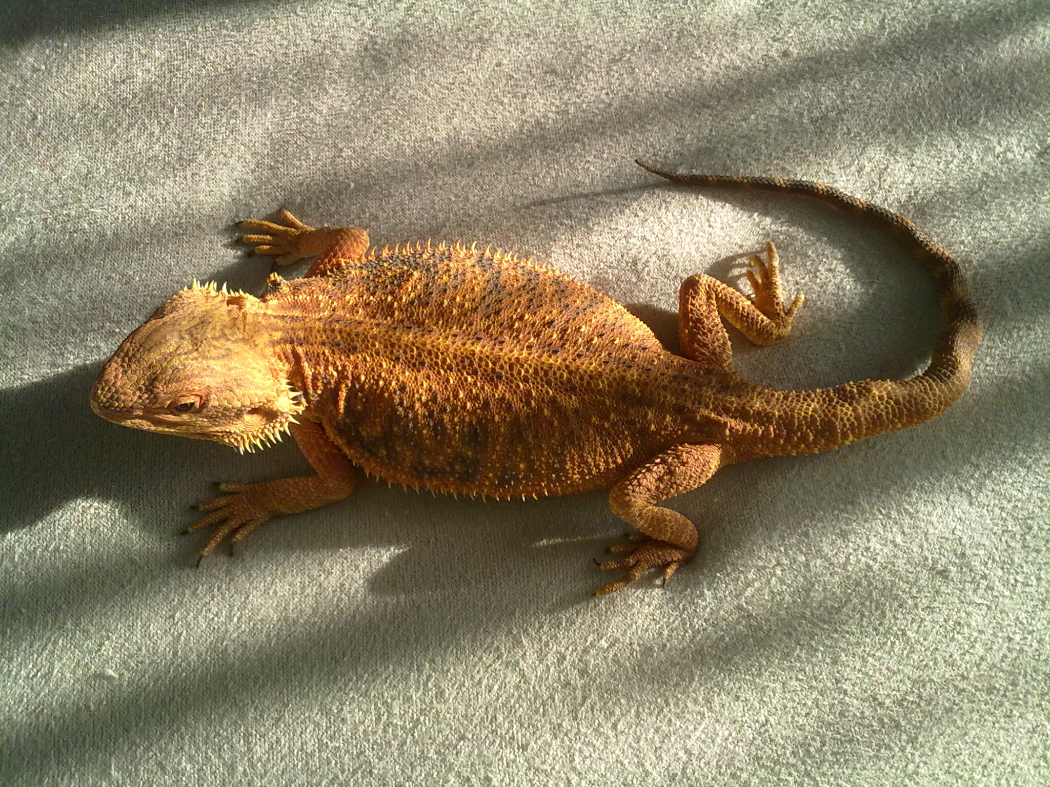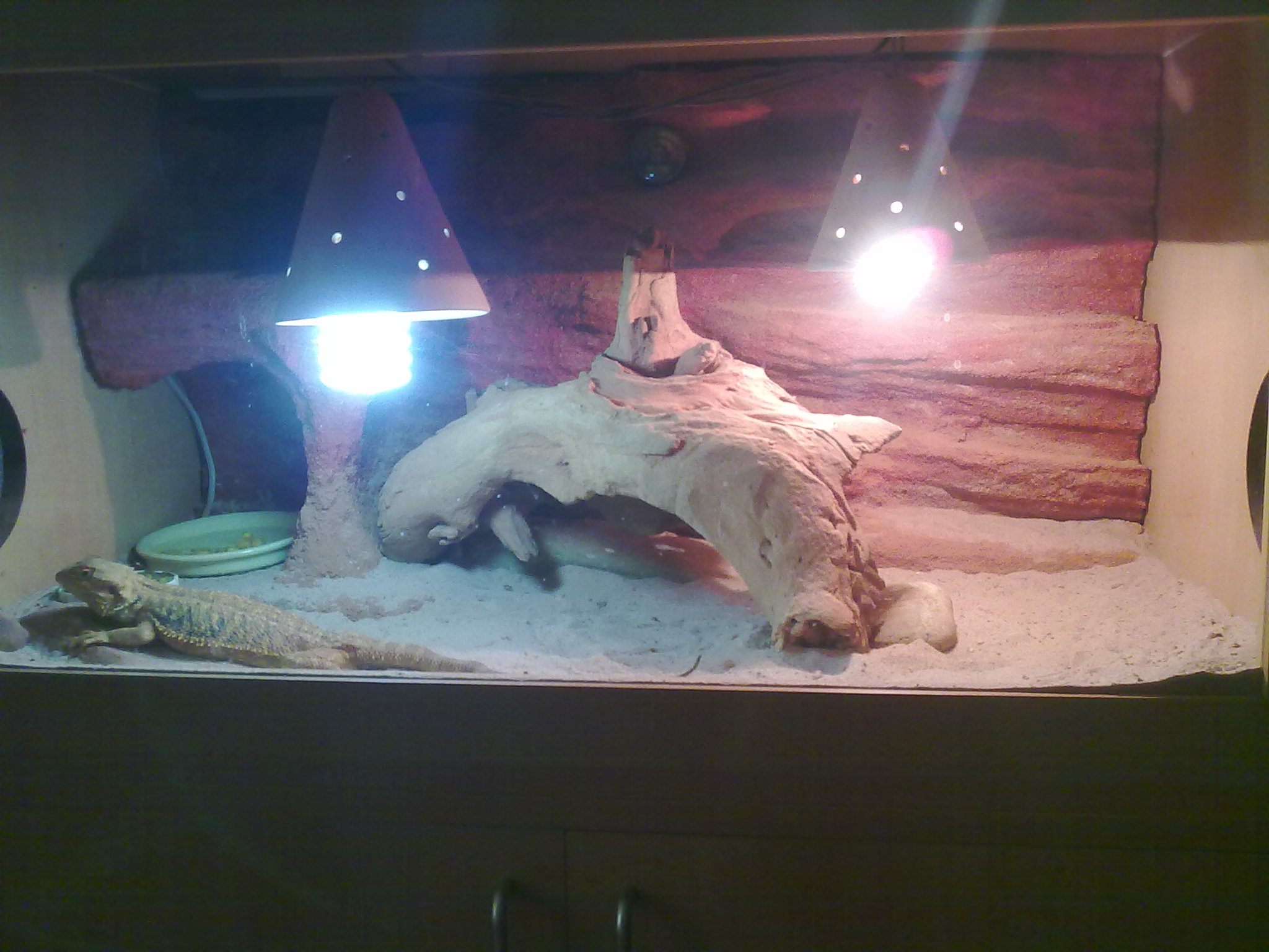 Terárko má rozměry 90/50/50 cm, žárovka ReptiGlo 10.0 uvb 26W, výhřevná Exo Terra Dey Glo Tight Beam 75W (teď 40W). Vitamíny dávám Plastin, Nutri Mix Rep Calci Plus a sepiovka namletá. Obaluju v tom jednoho cvrčka co druhý den. Teplotu má 32-34 stupňů, v noci pokojovou teplotu 20stupňů.