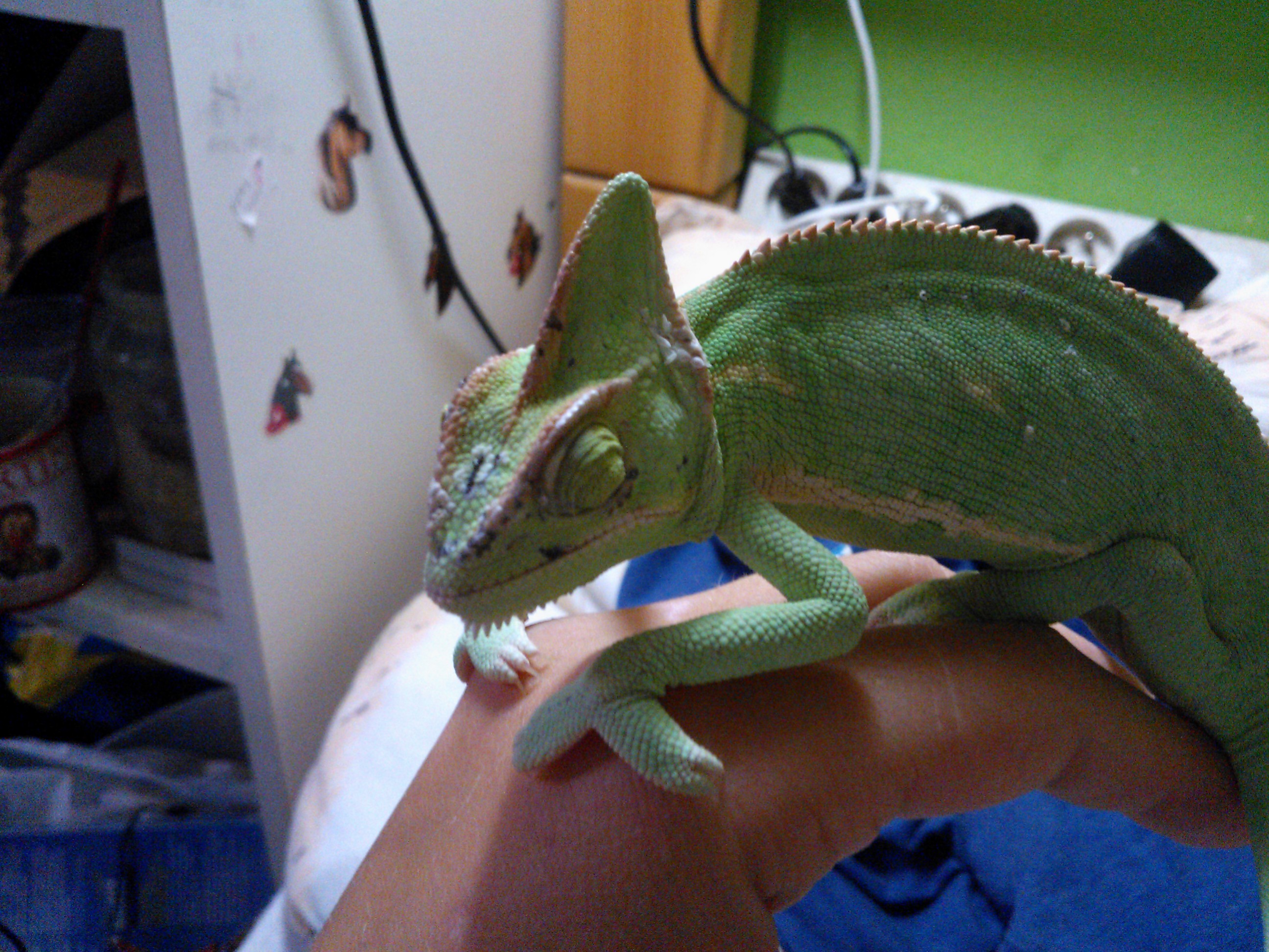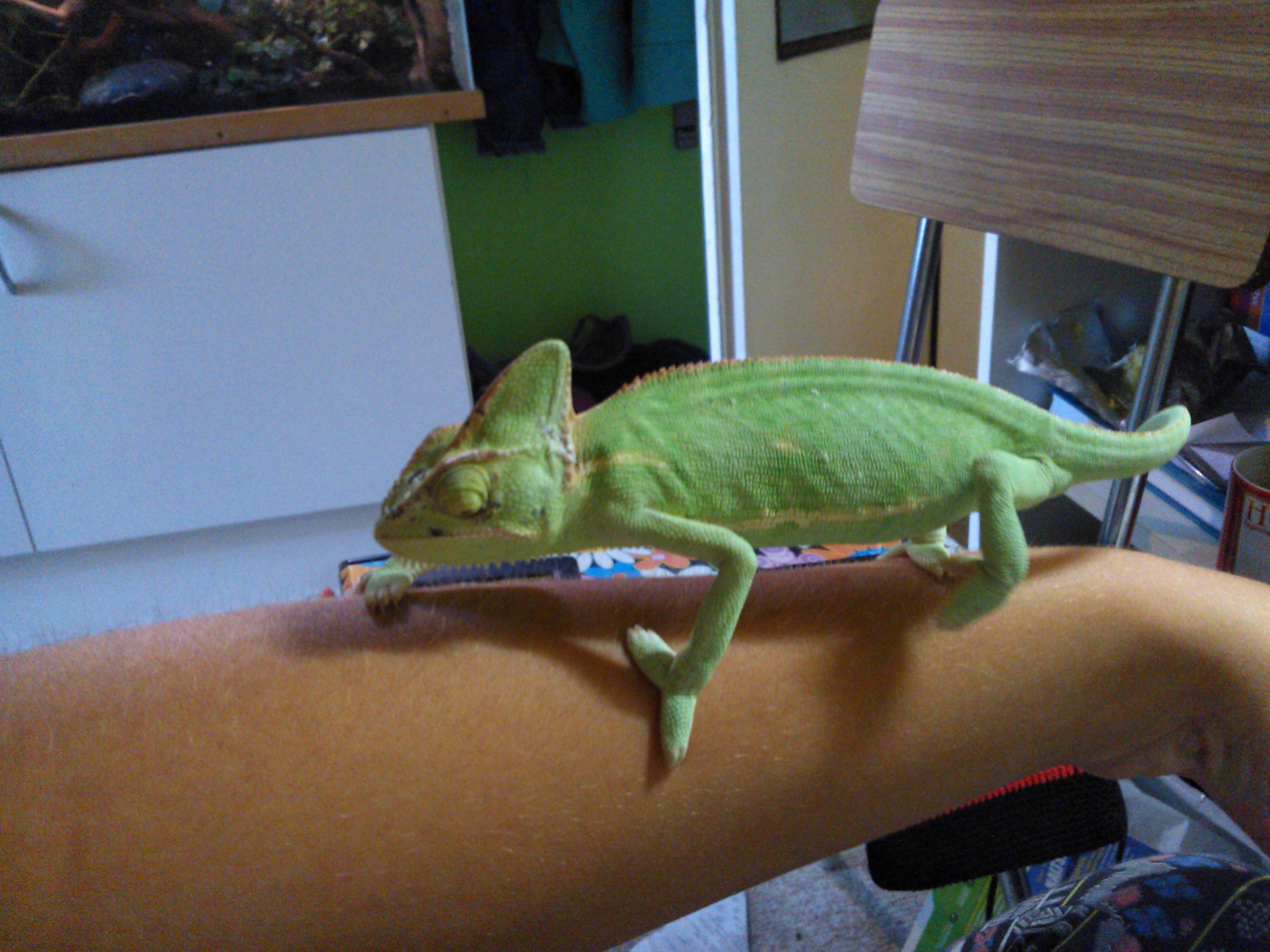 Dobrý den, před dvěma týdny jsem dostala samičku chameleona jemenského. Dosud jsem chovala samce (stejné velikosti jako je samička). Samička pochází z burzy, kde byla zakoupena bez části ocásku (ten je už zahojený). O předchozím chovu nevím nic. Nemám zatím jinou možnost než mít chameleony spolu (v nejbližší době plánuji postavit druhé terárium). Jejich soužití je, myslím, bezproblémové, neútočí na sebe, prakticky se ignorují. Každý má svoje místečko :) No ale všimla jsem si, že na sobě má samička jakési šrámy. Čekala jsem, až se začne svlékat, jestli snad nezmizí, ale objevilo se jich víc. Terárium 63x38x83(výška), rosím ráno rostliny a boční sklo, odpoledne jen sklo. Celý den mají k dispozici misku s vodou, krmím cvrčky, kobylkami, můrami, motýly, zkrátka co se najde. Dvakrát týdně podávám vitamíny a třikrát týdně vápník. Zářivka kvůli UVB a vyhřívací místečko mají samozřejmě také.