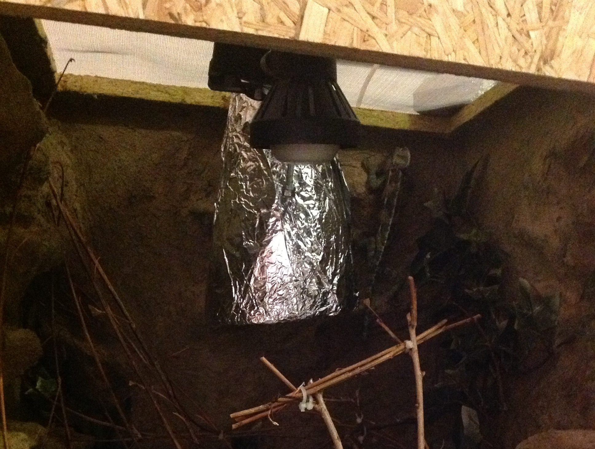 Delali jsme postupne, puvodne bylo nejakou dobu osvetleni polozene na pletivu. Dnes mel konecne manzel moznost protahnout draty dovnitr, takze uvb visi v terku v obale ala kvetinac (kuzel z pletiva obaleny alobalem, kvetinac mi prisel zbytecne velky a tezky), teplo zajistuje pripinaci (na klip) lampicka s zarovkou 40W. Premisteno bylo kvuli lepsim svetelnym a tepelnym podminkam. Vetvicky jsou v dostatecne vzdalenosti, aby se mlade nedostalo moc blizko. Jenze, coz jsem nepredpokladala, chamik na ne lezenahoru.