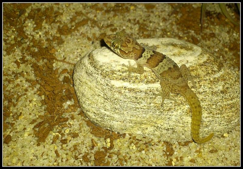 Informace, které vím : gekoni dospívají kolem osmi měsíců a dorůstají cca 10cm, ale prý již třeba v pěti měsících lze nalézt vajíčka, krmí se převážně cvrčkama odpovídající velikosti, ale občas můžou mít i moučnýho červa a v létě klidně mouchy, pavouky a jiný hmyz. Každé krmení je nutné obalovat ve vitamínové směsi, např.Roboran, terárium mám velké 80x40x40, svítím 40W žárovkou, teplota se pohybuje 25-29°C, pod žárovkou i 35°C a v noci pokles na 20-23°C, měly by být v teráriu různé tepelné zóny, gekon si sám najde tu, která mu bude vyhovovat, každý večer porosím jeden roh terária, kvůli udržení vlhkosti, v teráriu mám písek, pod žárovkou plochý kámen (po zhasnutí se tam chodí vyhřívat), kůru, větve, pozadí z polystyrenu a také malou plochou misku s vodou, kterou je nutné pravidelně měnit. Je třeba jim vytvořit nějaký úkryt, např. kokosový ořech, kus kůry, něco, kde se můžou přes den schovat a nebudou rušeni.