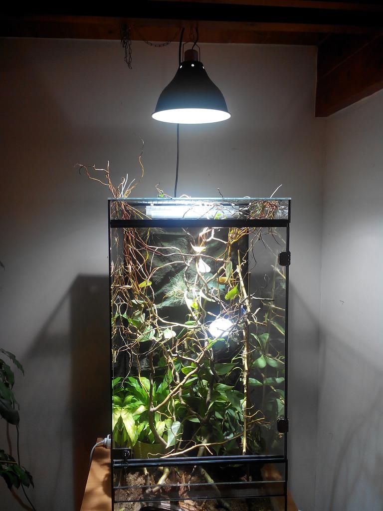 Osvětlení: Výbojka SunLux UV 70W PAR 38, zavěšeno cca 39 cm nad vyhřívací větví (lze jednoduše modifikovat). Jako doplněk "kuchyňská" zářivka T5 (v současnosti téměř bez efektu)