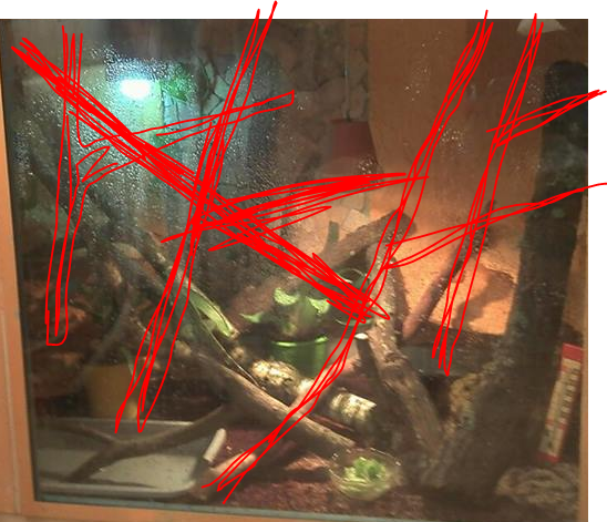 Navíc jak tak koukám, tak jestli jsou ty 4 kolečka jediné větrání, tak to naprosto nemůže větrat a bude tam mít saunu - větrání musí být ze dvou stran - ideálně část stropu a pak aspoň pár průduchů - to je taky třeba doopravit, protože v takhle vlhkým terárku to bude průšvih.
